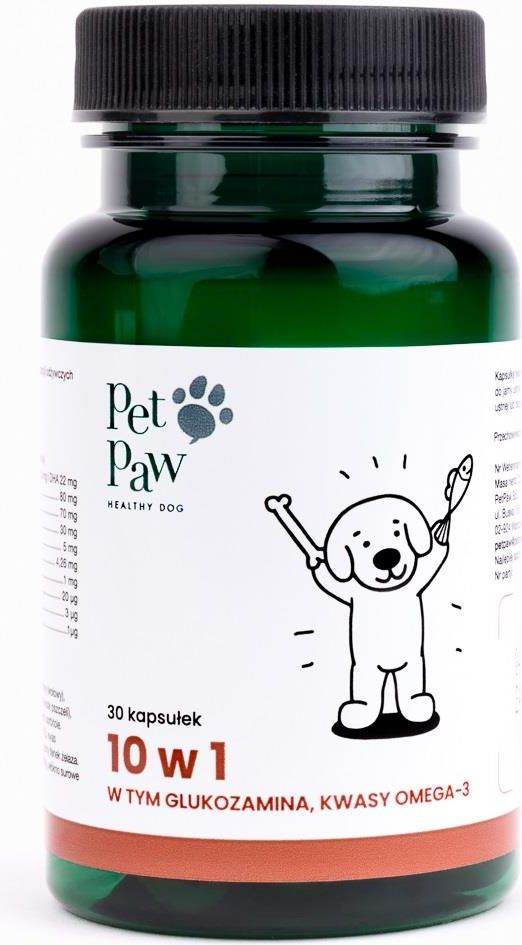 PetPaw 10 W 1 – Wszechstronne Wsparcie Zdrowia Twojego Psa. OPAKOWANIE - 30 KAPSUŁEK TWIST-OFF Nie czekaj na pierwsze oznaki osłabienia – wspieraj zdrowie psa na co dzień. PetPaw 10 W 1 działa od wewnątrz, chroniąc odporność, stawy, skórę i ogólną kondycję. Co zawiera? 10 kluczowych składników, które wspierają organizm psa na wielu poziomach: Kwasy Omega-3 (EPA i DHA)– dla odporności, sprawnych stawów, zdrowej skóry i mózgu Glukozamina + chondroityna – chronią stawy i wspierają ich regenerację Witaminy C, D3, E, B3, B6, B12 + cynk– wzmacniają odporność, metabolizm i kondycję skóry Każdy składnik dobrany z myślą o działaniu profilaktycznym i realnym wsparciu codziennego funkcjonowania psa, niezależnie od jego wieku. Dla kogo? Dla opiekunów, którzy nie chcą czekać, aż pojawi się problem. PetPaw 10 W 1 sprawdzi się: jakocodzienne wsparciedla psów zdrowych i aktywnych, jakoprofilaktykau ras narażonych na problemy ze stawami, skórą, odpornością, jako naturalne uzupełnienie diety– szczególnie gdy karma nie pokrywa wszystkich potrzeb, u szczeniąt, które intensywnie się rozwijają, u seniorów, których organizm potrzebuje wsparcia w regeneracji i ochronie przed skutkami starzenia. Bo najskuteczniejsze leczenie to to, którego nigdy nie trzeba wdrażać. Dlaczego PetPaw? Kapsułka twist-off– podajesz wygodnie: w całości, do karmy lub bezpośrednio Smaczna dzięki olejowi rybiemu– pies zje ją bez problemu Bezpieczeństwo GMP– każda kapsułka powstaje zgodnie z rygorystycznymi normami Jedna kapsułka dziennie– proste rozwiązanie na wiele potrzeb SKŁADNIKI OMEGA 3 (w tym EPA i DHA) – są niezbędne w diecie psa, ale niewytwarzane przez organizm, więc należy je codziennie suplementować. Podawanie kwasów omega 3 naszemu psu odgrywa istotną rolę w kompozycji zbilansowanej diety. Oto 5 najważniejszych funkcji kwasów omega 3 dla psa: Wsparcie funkcjonowania układu odpornościowego EPA i DHA wspomagają funkcjonowanie układu immunologicznego poprzez zmniejszanie reakcji zapalnej. Wspomaganie pracy mózgu i funkcji poznawczych DHA wspomaga rozwój mózgu i zapobiega jego pogorszeniu wraz z wiekiem psa oraz może pozytywnie wpływać na pamięć i funkcje poznawcze. Wsparcie zdrowych stawów. Sztywne, lekko obolałe stawy spowodowane codzienną aktywnością mogą być problemem. Podawanie kwasu omega 3 psu zmniejsza stan zapalny w stawach, który powoduje obrzęk i ból. Wspomaganie pracy serca. Pozytywnie wpływa na poprawę pracy serca, obniżenie ciśnienia krwi oraz dzięki zawartości EPA obniżenie stanu zapalnego oraz może pomóc w unormowaniu masy ciała psa. Redukcja alergii i poprawa wyglądu sierści. Omega 3 wspomagają nawilżenie skóry psa, co może pomóc w ograniczeniu linienia, zapobieganiu łupieżowi i zmniejszaniu swędzenia. CHONDROITYNA – jeden z podstawowych składników chrząstki i mazi stawowej, który ma wpływ na ruchomość stawów. Wspiera regenerację chrząstki stawowej. GLUKOZAMINA – korzystnie wpływa na prawidłowe funkcjonowanie stawów, zapewniając im sprężystość i wytrzymałość. Wspomaga odbudowę chrząstki stawowej, wzmacnia ją i zmniejsza ewentualny stan zapalny i sztywność stawów. WITAMINA C – wspomaga w sytuacjach przeciążenia, wzmacnia układ odpornościowy. CYNK – wpływa na poprawę stanu skóry i sierści. NIACYNA – witamina B3 pomaga w syntezie hormonów, obniża poziom cholesterolu i poprawia pamięć. WITAMINA E – wspiera ochronę organizmu przed wolnymi rodnikami. Pomaga rozwinąć zdrowy układ odpornościowy. WITAMINA B6 – czasami nazywana pirydoksyną jest niezbędna dla metabolizmu aminokwasów. Utrzymuje równowagę sodowo-potasową i jest niezbędna w regulacji wody przez organizm. WITAMINA B12 – znana również jako kobalamina, jest ważna dla układu nerwowego i zdrowia układu pokarmowego psa. WITAMINA D3 – korzystnie wpływa na sprawność układu immunologicznego. Pomaga w utrzymaniu zdrowych i mocnych kości, odpowiedzialna za kontrolowanie stanu zapalnego.