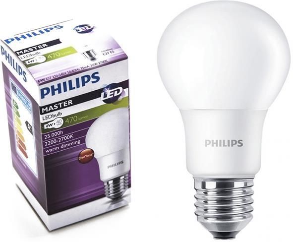 PHILIPS - Żarówka LED MASTER LEDbulb DT Cechy produktu Strumień świetlny: 470 lm Barwa światła: Ciepła (WW) Temperatura barwowa: 2200-2700 K Moc: 6W Odpowiednik klasycznej żarówki: 40W Trzonek: E27 Ściemnialna: Tak Etykieta energetyczna: A+