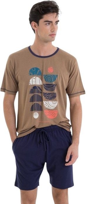 Męska piżama L251312 Camel z mieszanki dzianiny bawełnianej oraz wiskozy, składająca się z koszulki z nadrukiem z przodu, krótkimi rękawami, okrągłym dekoltem z kontrastowym obszyciem, do którego kolorystycznie pasują spodenki. Taka kompozycja dodaje dynamizmu. Solidne granatowe szorty z troczkiem …