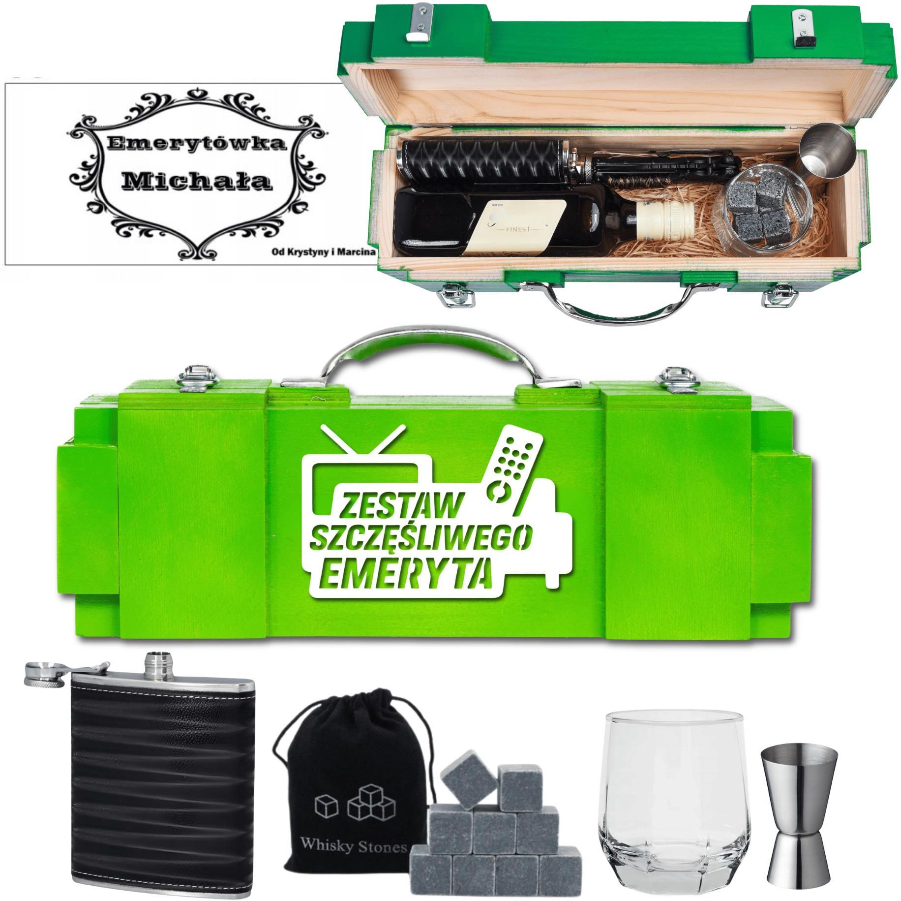 Prezent Dla Emeryta Skrzynka Na Alkohol Zestaw Szczęśliwego Emeryta Zestaw Premium Szklanka Kieliszek Kamienie Lodowe Piersiówka Kraków