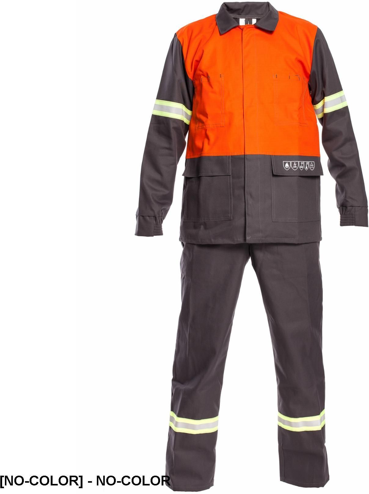 Ubranie ochronne Procera 5w1. Posiada właściwości: - trudnopalne, - antyelektrostatyczne, - chroniące przed termicznym działaniem łuku elektrycznego oraz chemikaliami - odpowiednie dla spawaczy. Zestaw składający się z: - bluzy, - spodni. Przeznaczony do ochrony użytkownika na stanowiskach, na których występuje zagrożenie: - zapaleniem w wyniku krótkotrwałego zetknięcia z płomieniem, - oddziaływaniem ciepła konwekcyjnego, - promieniowania cieplnego, - rozpryskiem stopionego żelaza oraz do prac gdzie wymagane jest rozpraszanie ładunku elektrostatycznego, - oraz występuje zagrożenie kontaktu z chemikaliami. Bluza zapinana na napy YKK, kryte plisą, dwie kieszenie wewnętrzne, dwie kieszenie dolne kryte patką zapinaną na rzep. Spodnie do pasa zapinane na guzik, dwie kieszenie boczne, kieszeń miarowa na prawej nogawce, rozporek zapinany na guziki, pas z tyłu z gumą do regulacji obwodu. Przeszycia: trudnopalne nici kontrastowe. Skład materiału: - 99% bawełna , 1% antyelektrostatyczna nić węglowa, – Gramatura: 350g/m2 – Kurczliwość: 2-3% Tkanina wysoce wytrzymała na rozdzieranie, rozrywanie i tarcie oraz o wysokim komforcie użytkowania. Odzież spełnia wymagania norm: - EN ISO 13688:2013, - EN 1149-5:2008, - EN ISO 11612:2015, - EN ISO 11611:2015, - EN 13034:2005+A1:2009, - IEC 61482-2:2009. Posiada certyfikat oceny typu WE wydany przez Instytut Włókiennictwa w Łodzi. (nr jednostki notyfikowanej 1435) Wyprodukowano w Polsce. Kolor: granatowo-pomarańczowy. Rozmiary od 48-62 - tabela rozmiarów w grafice.