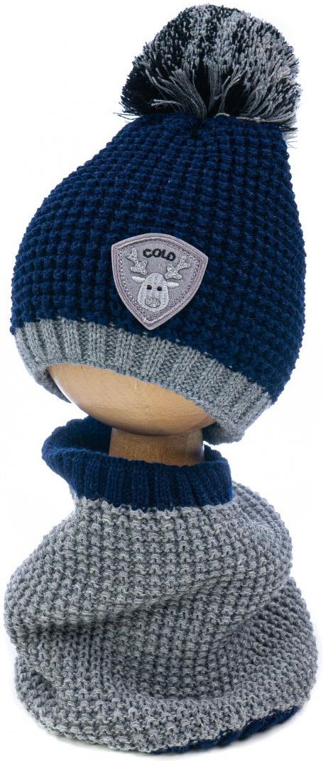 Komplet chłopięcy składający się z czapeczki i kominka. Został wykonany w całości z wysokogatunkowego akrylu. Czapka dwuwarstwowa. Kominek dwuwarstwowy w kolorze czapki. Komplet idealnie sprawdzi się u dziecka w sezonie jesienno-zimowym. Skład: 100% akryl Obwód: Czapka- 46cm-48cm, Kominek- naciąga się od 44cm do 50cm, wysokość 22 cm Sugerowany wiek: 1 – 2 lat