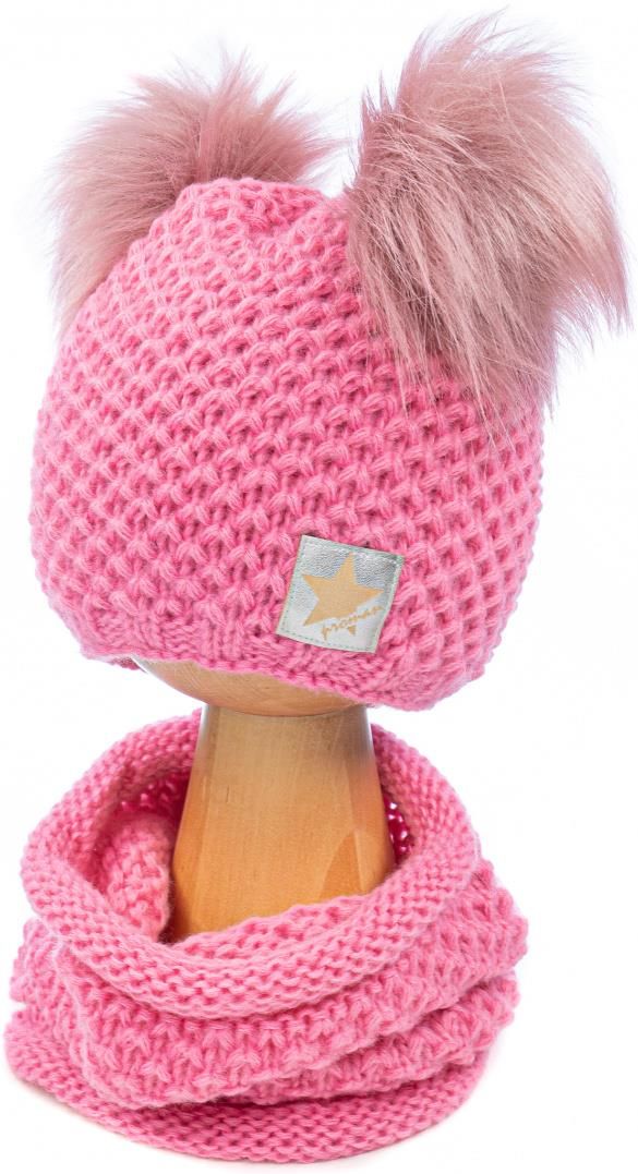Elegancki komplet dziewczęcy składający się z czapki i komina, Cały zestaw został wykonany z wysokogatunkowego akrylu czesanego, miłego w dotyku, Czapka ciepła, dwuwarstwowa. Posiada modne dwa pompony futrzane i ekskluzywną skórkę, Komin wsuwany przez głowę w kolorze czapki, bardzo dobrze przylega i otula szyję, Idealnie sprawdzi się w sezonie jesienno-zimowym. Skład: 100% akryl czesany Sugerowany wiek: od 2 lat Obwód: Głowa- 48cm-50cm, Komin- szerokość 25 cm, wysokość 25 cm