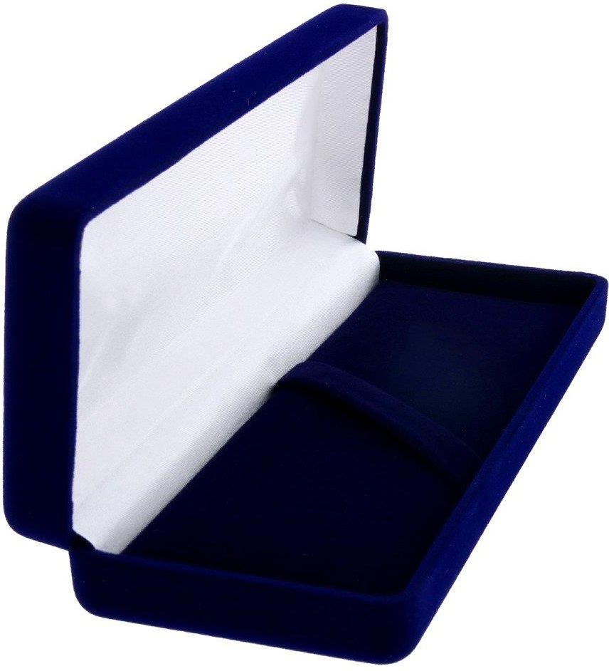 Eleganckie opakowanie jubilerskie wykończone granatową tkaniną welurową oraz białą satyną. Wkładka z ukośnym paskiem oraz podłużny kształt sprawiają, że idealnie nadaje się jako pudełko prezentowe na pióro lub łyżeczkę. Wymiary pudełka: 155x60x31 mm
