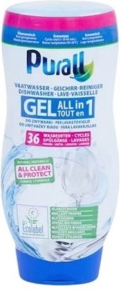 Purall Żel All in 1 do zmywarki 0,72 L Purall All in 1 Żel do Zmywarki to skuteczna, skoncentrowana formuła o zwiększonej wydajności z solą i nabłyszczaczem. Doskonale usuwa nawet zaschnięte zabrudzenia z twoich naczyń nadając im idealny połysk. Rozpuszcza się 5 razy szybciej niż kapsułki, co pozwala oszczędzać wodę i energię. Żel Purall All-in-1 został stworzony bez dodatku fosforanów, co oznacza, że jest przyjazny dla środowiska. Możesz cieszyć się czystymi naczyniami, nie martwiąc się o negatywny wpływ na planetę. Wygodna butelka z niekapiącym dozownikiem pozwala na precyzyjne dawkowanie produktu w zależności od potrzeb. Opakowanie Purall All in 1 wystarcza nawet na 36 cykli zmywania. Dzięki ulepszonej formule żelowej koncentrat rozpuszcza się 5 razy szybciej niż tradycyjna tabletka do zmywarki. Nieskazitelnie czyste naczynia oraz oszczędność energii i wody dzięki Purall All-in-1. Działa nawet w niskich temperaturach i krótkich programach mycia. Bez problemów usuwa nawet zaschnięte resztki jedzenia, tłuszczu czy brudu pozostawiając naczynia pełne blasku. Duża pojemność 720ml to, aż 36 cykli mycia.