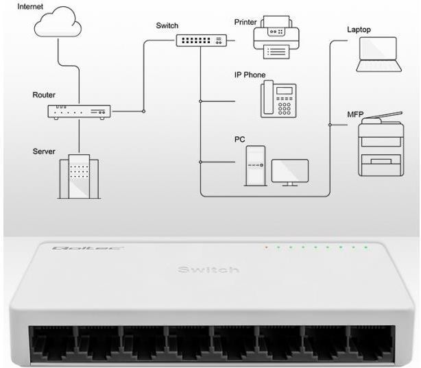 Przełącznik sieciowy Qoltec 8xRJ45 100Mbps Fast Ethernet LAN | do domu i biura Idealny switch LAN do rozbudowy domowej i firmowej sieci komputerowej Szukasz niezawodnego i prostego w instalacji przełącznika sieciowego? Qoltec SWITCH 8-portowy Fast Ethernet 100Mbps to wydajne i kompaktowe rozwiązanie, które umożliwia szybkie i stabilne połączenie aż 8 urządzeń – bez opóźnień, bez skomplikowanej konfiguracji! Parametry Symbol: 52246 Producent: Qoltec Zasilanie: 5-12V / 0.6A Interfejs: RJ45 Max. przepustowość: 1.6Gbps Szybkość przesyłu: 100Mbps Zastosowanie: Komunikacja, Internet Kolor: Biały Temperatura pracy: -10°C ~ 55℃ Wymiary (G/D x Sz x W): 56 x 126 x 21 mm Opakowanie: Pudełko Zawartość opakowania: 1 x Przełącznik sieciowy 1 x Zasilacz 1 x Instrukcja obsługi Głębokość / Długość opakowania [mm]: 65 Szerokość opakowania [mm]: 130 Wysokość opakowania [mm]: 60 Waga netto [kg]: 0.128 Waga brutto [kg]: 0.165 Najważniejsze cechy urządzenia Qoltec SWITCH 8 portów RJ45 – automatyczne krosowanie (Auto MDI/MDI-X) Szybkość transmisji: 10/100 Mbps (Fast Ethernet) Zasięg transmisji sygnału aż do 150 metrów Obsługa pełnego i pół dupleksu – zgodność ze standardem IEEE802.3X Do 1024 adresów MAC – świetna skalowalność dla większych sieci Wydajne chłodzenie + ekranowane porty 8-pin – stabilność nawet przy dużym obciążeniu Diody LED – szybka kontrola statusu pracy urządzenia Technologia Plug & Play – błyskawiczna instalacja bez konfiguracji Zastosowanie – gdzie sprawdzi się najlepiej? W domowej sieci multimedialnej – do podłączenia telewizorów, konsol, NAS-a W biurze – do komputerów, drukarek, punktów dostępowych Wi-Fi W monitoringu – podłącz kamery IP bez zbędnych kabli i skomplikowanych rozwiązań W systemach prezentacyjnych – transmisja do kilku odbiorników jednocześnie Jak zainstalować switch Qoltec? To proste! Podłącz kabel sieciowy z routera do dowolnego portu RJ45 Do pozostałych portów podepnij urządzenia (komputery, dekodery, TV itd.) ✔ Sprawdź diody LED – aktywność = połączenie gotowe Gotowe – zero konfiguracji, zero problemów Najczęstsze pytania Czy urządzenie wymaga konfiguracji? Nie – działa od razu po podłączeniu (Plug & Play). Czy można użyć switcha do kamer monitoringu IP? Tak – to idealny wybór do systemów monitoringu. Czy switch działa z routerami różnych marek? Tak – współpracuje z każdym urządzeniem sieciowym posiadającym port RJ45. Jakie są realne prędkości transmisji? Do 100Mbps na każdy port – idealnie do internetu, filmów HD i pracy biurowej. Czy urządzenie obsługuje połączenia w pełnym dupleksie? Tak – zgodność z IEEE802.3X zapewnia wysoką wydajność. Podsumowanie – postaw na stabilność i prostotę! Qoltec SWITCH 8xRJ45 100Mbps to idealny wybór do rozbudowy Twojej sieci lokalnej LAN. Sprawdzi się wszędzie tam, gdzie liczy się stabilność, niezawodność i prosty montaż. Bez konfiguracji, bez zbędnych kosztów – tylko szybkie i pewne połączenia. Kupujesz bezpośrednio od producenta marki Qoltec, co oznacza PEWNE POCHODZENIE PRODUKTU – masz pewność, że urządzenie pochodzi z oficjalnej dystrybucji i jest objęte pełnym wsparciem producenta, WSPARCIE TECHNICZNE – profesjonalna pomoc na każdym etapie użytkowania, TOWAR WYSOKIEJ JAKOŚCI – produkty spełniające najwyższe standardy, SERWIS PRODUCENTA W POLSCE – szybka i sprawna obsługa realizowana lokalnie. Z nami masz pewność dobrego wyboru! Jakość naszych produktów została wyróżniona Laurem konsumenta 2022 oraz 2024 Jest to prestiżowa nagroda przyznawana firmom wyróżniającym się na rynku jakością oraz innowacyjnością