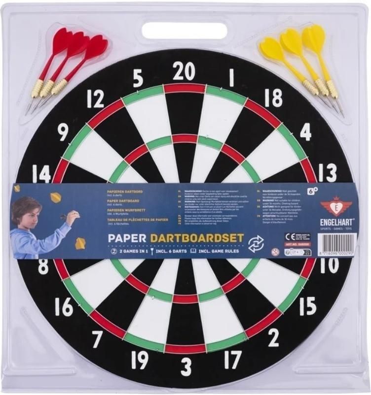 Dwustronna papierowa tarcza do darta z 6 mosiężnymi lotkami o wadze 18 gramów. Grubość tarczy do darta wynosi 1 cm, a średnica 43 cm.