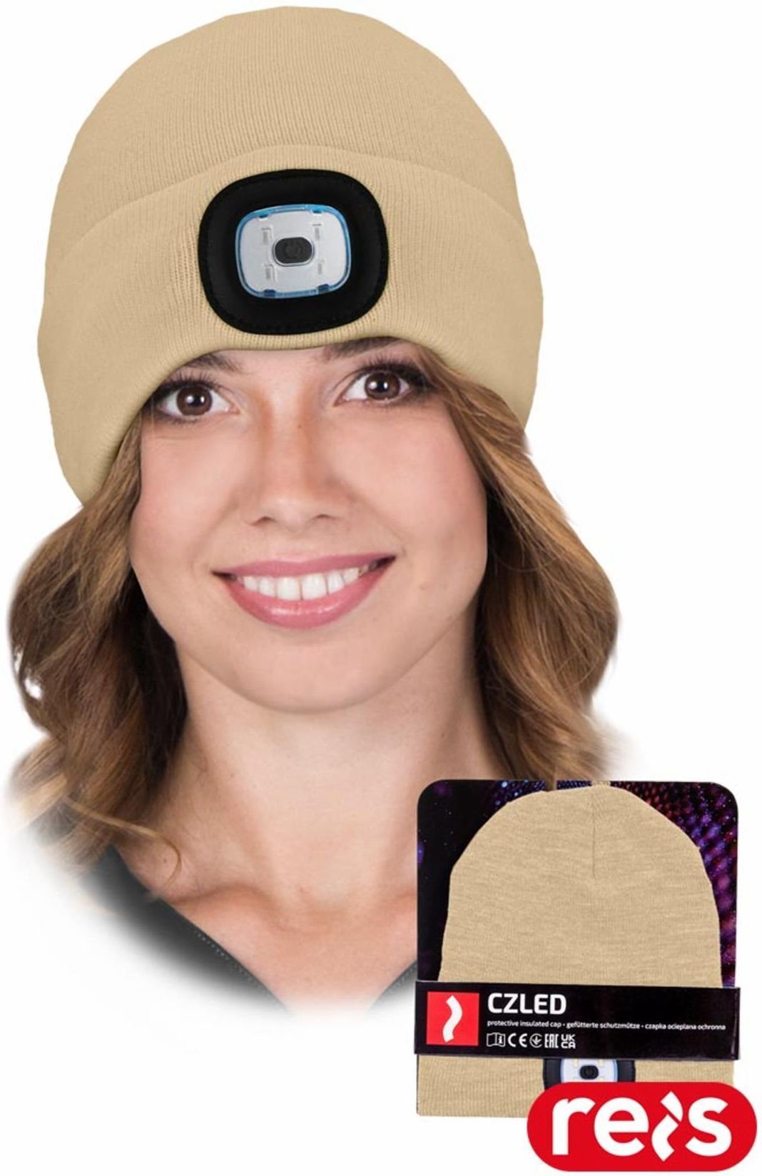 CZLED.Czapka zimowa led z latarką. 100% przędza akrylowa. Podszewka 100% poliester. Podwójna warstwa materiału lepiej chroni przed zimnem. Od wewnętrz ocieplana polarem. Na przodzie czapki znajduje się wyjmowana latarka led ładowana za pomocą złącza USB. Obudowa latarki wykonana z miękkiej gumy, która nie przeszakdza w użytkowaniu czapki. Latarka posiada trzy stopnie świecenia. Sprawdza się nie tylko zimą, ale również późną jesienią czy też wczesną wiosną. Każda sztuka posiada torebkę oraz zawieszkę, które umożliwiają wygodną prezentację na wystawie.Marka: REIS. Geneza symbolu CZLED: CZ-czapka, LED-latarka led. Normy: ENISO13688. Produkt polecany dla branż: logistyka w tym transport i przeładunek (prace magazynowe), obróbka metali oraz operatorzy maszyn i urządzeń oraz ich naprawa, prace budowlane i remontowe, prace montażowo-instalacyjne, bvudowa dróg, przemysł samochodowy w tym budowa, mechanika i naprawa pojazdów oraz lakiernictwo, przemysł wydobywczy w tym górnictwo, rolnictwo, ogrodnictwo, leśnictwo, łoowiectwo, rybactwo. Kolory: czarny, beżowy, zielony butelkowy, brązowy, czarno-szary, granatowy, khaki, kremowy, moro, pomarańczowy, różowy, szary/stalowy, żółty. Rozmiar: UNI. Marka: REIS