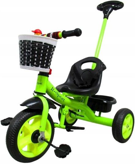 KOLOR ZIELONY Rowerek trójkołowy z rączką (pchaczem) dla dzieci Model T8 - pchacz Marka R-Sport PIANKOWE KOŁA EVA! KOLOR ZIELONY Na innych aukcjach oferujemy inne kolory. Zapraszamy Rowerek trójkołowy dla dzieci. Dziecko kieruje rowerkiem za pomocą kierownicy, w ruch rowerek wprawiany jest za pomocą pedał. Trzykołowa konstrukcja zapewnia rowerkowi pełną stabilność. Rowerek posiada koszyczek z tyłu. Rowerek przeznaczony na wiek 2,5-6 lat Wyposażenie: PIANKOWE KOLOROWE KOŁA EVA Koszyczek tylny i przedni, Rączka do pchania dla rodzica (pchacz), Błotnik na przednim kole, Szerokie i wygodnie siedzisko, Pasy bezpieczeństwa, Solidna metalowa konstrukcja, Kierownica z miękkim obiciem, Interesujący dzwoneczek, Antypoślizgowe rączki kierownicy Antypoślizgowe pedała, Składany podnóżkek na nogi, Dane techniczne wysokość kierownicy rowerka: 58 cm wysokość góry siedziska rowerka: ok 49 cm siedzisko jest na poziomie ok 32 cm (od podłoża) wysokość rączki: ok 87 cm wysokość do podnóżka: ok. 14 cm, długość: 72 cm (bez razcki) szerokość: 46 cm, Siedzonko: szer. ok 23 cm, głębokość ok 16 cm, średnica kół: przednie - 25 cm, tylne - 22,5 cm, szerokość kół: ok 6 cm, wymiar koszyka tylnego: 24 cm x 16,5 cm, waga: 3/4 kg, maksymalne obciążenie do 25 kg, rowerek jednoosobowy, marka R-Sport, pakowanie: szary karton, rowerek do samodzielnego - stosunkowo prostego montażu, Ten piękny rowerek może stać się pierwszym pojazdem w życiu Twojego dziecka i przysporzyć mu niezapomnianych wspomnień z dzieciństwa, do których będzie wracał po latach. Kolorowy rowerek dla małego sportowca Producent deklaruje pojazd dla dzieci powyżej 3 roku życia, jednak jeżeli dziecko jest w stanie siedzieć samodzielnie, to nie ma przeszkód aby mogło go używać pod okiem osoby dorosłej. Idealny prezent dla Twojego dziecka! Piękne żywe kolory, które ucieszą nie tylko Twoje dziecko. Rowerek sprawi Twojemu dziecku wiele radości i frajdy a przebywanie na świeżym powietrzu stanie się ulubioną zabawą Twojego dziecka. Rowerek do samodzielnego stosunkowo łatwego montażu - prosta instrukcja w środku. Przed rozpoczęciem użytkowania należy dokładnie zapoznać się z instrukcją. Używanie rowerka wymaga każdorazowej ścisłej opieki i nadzoru osoby dorosłej. Rowerek przeznaczony do użytku prywatnego (niekomercyjnego). Zabawka posiada Certyfikat Zgodności CE. Każdy rowerek jest tylko zabawką, co powoduje że na powierzchni metalu plastiku mogły pozostać pozostałości poprodukcyjne w postaci wgniotek, przebarwień, rys. Serdecznie zapraszamy do zakupu!
