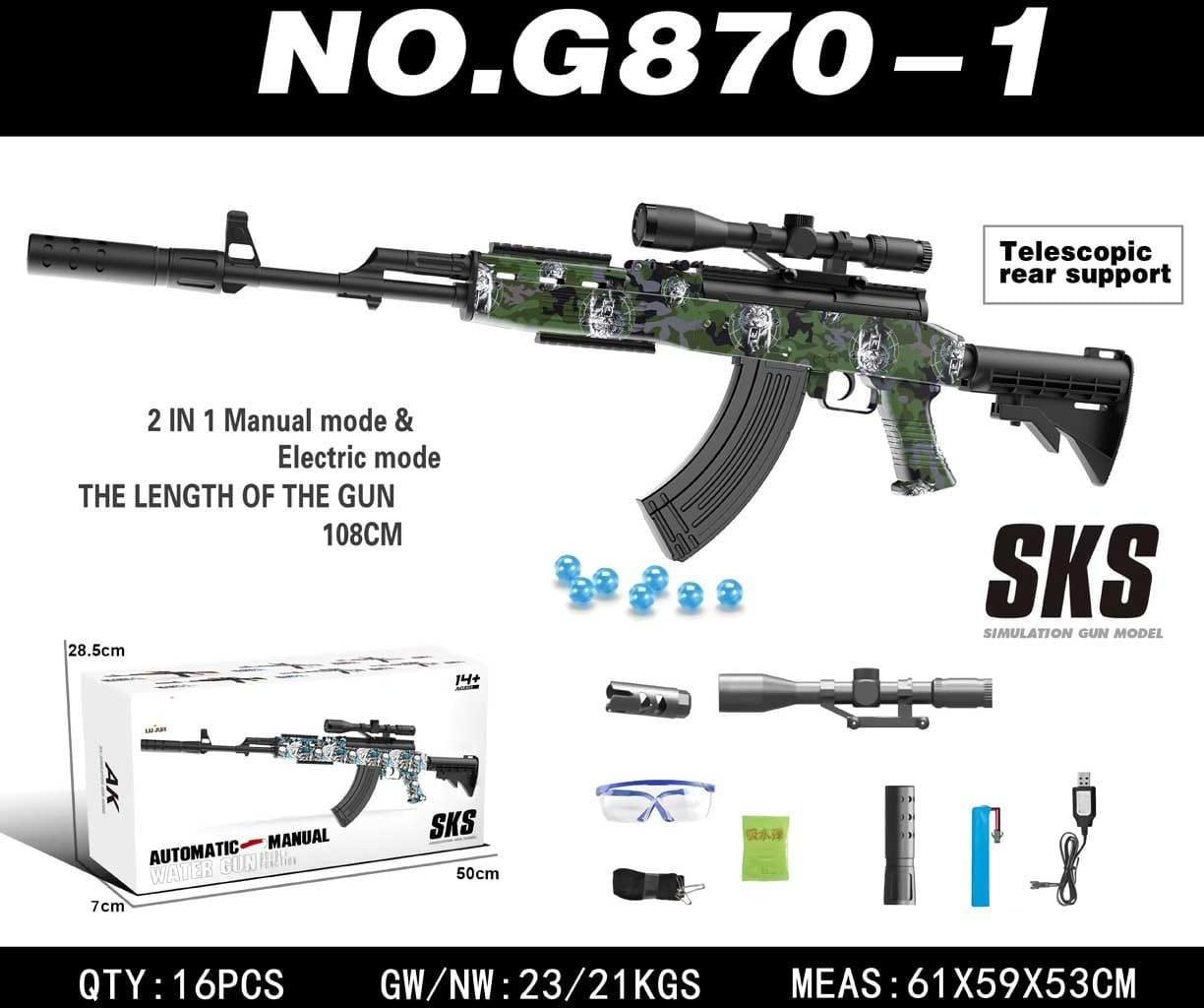 Opis Karabin SKS Na Kulki Żelowe + Akcesoria Duży karabin militarny SKS na kulki żelowe to propozycja dla dzieci od 14-go roku życia. Należy go używać ze specjalnymi kulkami z hydrożelem, które po uderzeniu w cel efektownie pękają i są bezpieczne dla dzieci. Zestaw zawiera saszetkę kulek nieprzygotowanych. Kulki przygotowuje się, zalewając je wodą i odstawiając na około 4-6 godziny, aby zwiększyły swoją objętość. Potem wystarczy odlać nadmiar wody i naboje są gotowe. W tym modelu należy stosować kulki o średnicy ok. 7-8 mm. Karabin posiada tryb strzelania ręcznego oraz automatycznego. Celownik wyposażono w szkło powiększające, można regulować pokrętłem odległość celu. W zestawie znajdują się akcesoria, takie jak lufa, tłumik, magazynek, kolba oraz okulary ochronne. Zabawka zasilana jest akumulatorem 7,4V, dołączonym do zestawu. Specyfikacja zabawkowy karabin SKS z akcesoriami, możliwość montażu ruchomych części, jak lufa, tłumik, magazynek, kolba, możliwość zamontowania celownika ze szkłem powiększającym i regulacją przybliżenia, tryb strzelania ręcznego lub automatycznego, w zestawie saszetka z kulkami z hydrożelu, kulki z hydrożelu pękają przy uderzeniu i są bezpieczne w użytkowaniu, wierne odwzorowanie prawdziwego karabinu, przeznaczony dla dzieci od 14-go roku życia, instrukcja montażu w zestawie. Wymiary karabin korpus ok. 46,5 cm x 19,5 cm x 3,5 cm, karabin z lufą i akcesoriami ok. 95 cm x 25,5 cm x 3,5 cm, karabin z tłumikiem i akcesoriami ok. 102 cm x 25,5 cm x 3,5 cm, okulary ochronne ok. 14,5 cm x 5 cm x 14 cm, opakowanie ok. 50 cm x 28,5 cm x 7,5 cm. Zawartość zestawu karabin, magazynek, lufa, tłumik, celownik z kolimatorem, kolba, USB kabel, akumulator 7,4V, saszetka z kulkami do przygotowania, smycz, okulary ochronne, instrukcja w języku angielskim, kolorowe opakowanie.