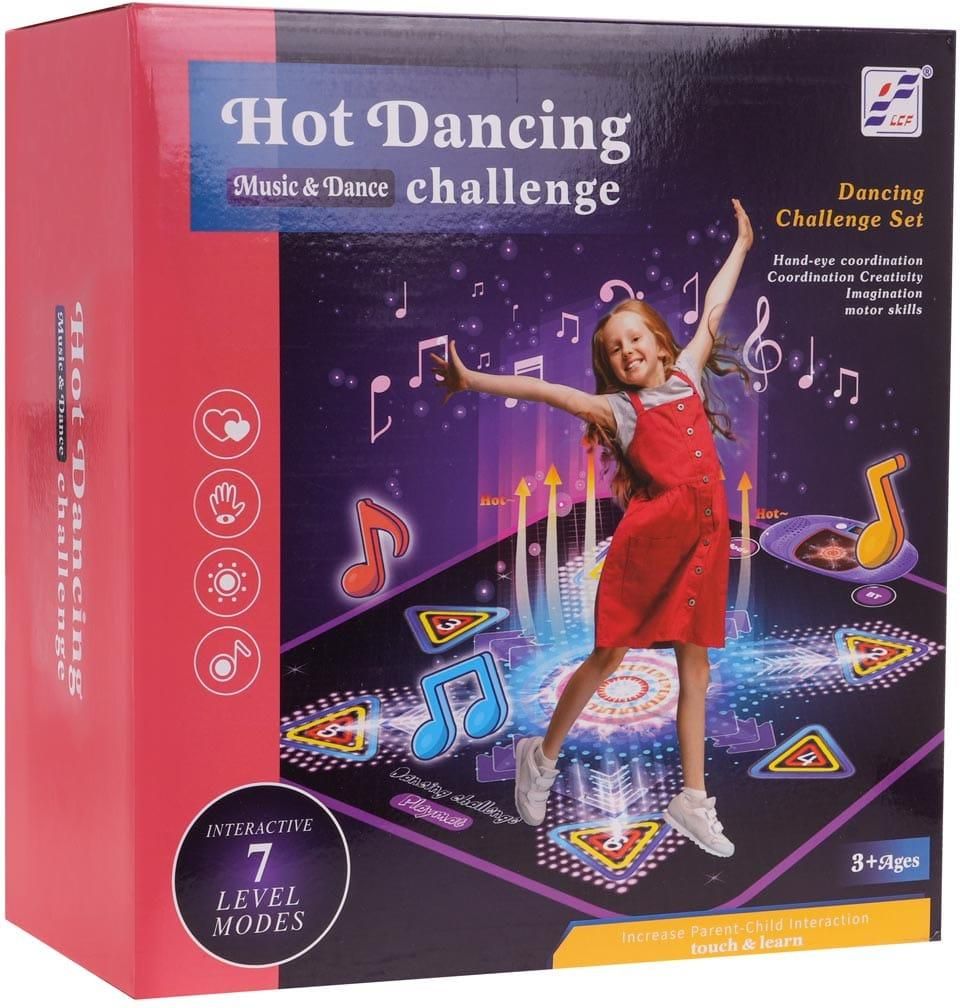 Opis Mata Taneczna z Funkcją Ciepła Mata do tańca z Bluetooth, oświetleniem i podgrzewaniem dla dzieci powyżej 3-go roku życia. Jest miękka i kolorowa, od spodu posiada warstwę antypoślizgową. Środek maty może nagrzewać się do 45 stopni by ogrzać zmarznięte stopy Twojej pociechy. Mata działa w 5 trybach: swobodnego tańca, gaszenia światełek na macie (tryb 2 i 3), pamięciowym i perkusyjnym. Możemy połączyć matę z telefonem przez Bluetooth. Mata zasilana jest akumulatorem typu 7,4 V 1800 mAh (w zestawie). Opis trybów maty Tryb 1 Tryb swobodnego tańca ze wbudowanymi 3 utworami. Tryb 2 W tym trybie mamy 3 poziomy trudności, każda runda po 1 minucie. Należy gasić światełka podświetlane przez matę. Tryb 3 W tym trybie mamy 6 poziomy trudności, każda runda po 1 minucie. Należy gasić światełka podświetlane przez matę. Tryb 4 Tryb pamięci, gracz musi powtórzyć sekwencje kolorowych świateł. Tryb 5 Tryb perkusji. Naciskając w poszczególne numery, usłyszymy 6 dźwięków perkusji. Funkcje maty odpowiednia dla dzieci powyżej 3-go roku życia, wybór języka (angielski, niemiecki, hiszpański), regulacja głośności, tryb swobodnego tańca ze wbudowanymi 3 utworami (tryb 1), tryb gaszenia światełek na macie (tryb 2 i 3), tryb pamięci, gracz musi powtórzyć sekwencję kolorowych światełek, 6 dźwięków perkusji, funkcja grzania do 45 stopni, możliwość połączenia maty przez bluetooth, tryb oszczędzania baterii, automatyczne wyłączenie po 5 minutach bezczynności. Wymiary - mata ok. 82 cm x 90 cm x 5,5 cm, - opakowanie ok. 25 cm x 27 cm x 12,5 cm, Zawartość zestawu mata taneczna, akumulator 7,4 V 1800 mAh, kabel do ładowania USB, instrukcja.