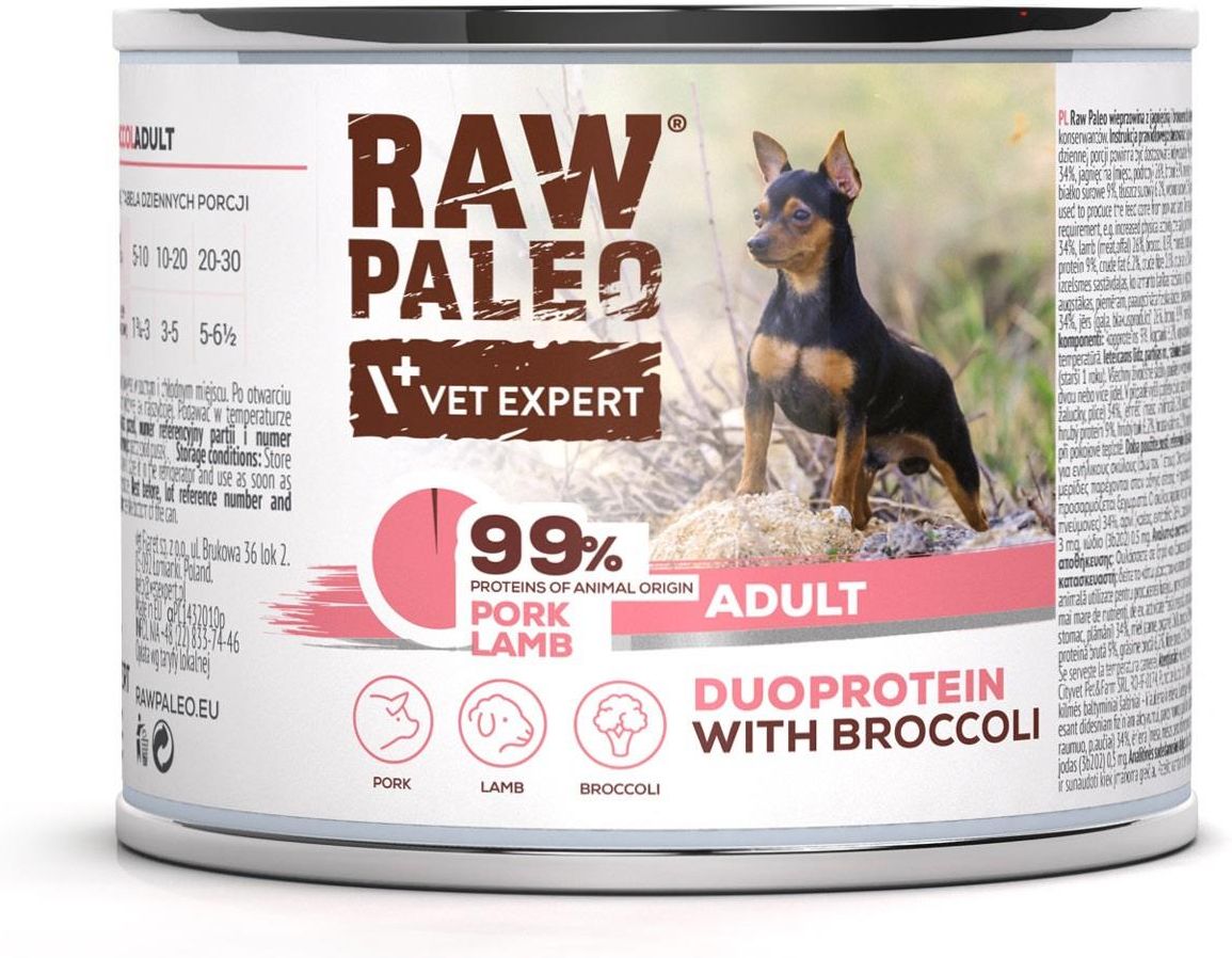 "Raw Paleo wieprzowina z jagnięciną i brokułem dla dorosłego psa to pełnoporcjowa karma dla psów dorosłych (powyżej 1. roku życia). Wszystkie składniki pochodzenia zwierzęcego użyte do wytworzenia karmy pochodzą z wieprzowiny i jagnięciny. Receptura nie zawiera zbóż (grain-free) ani konserwantów. …