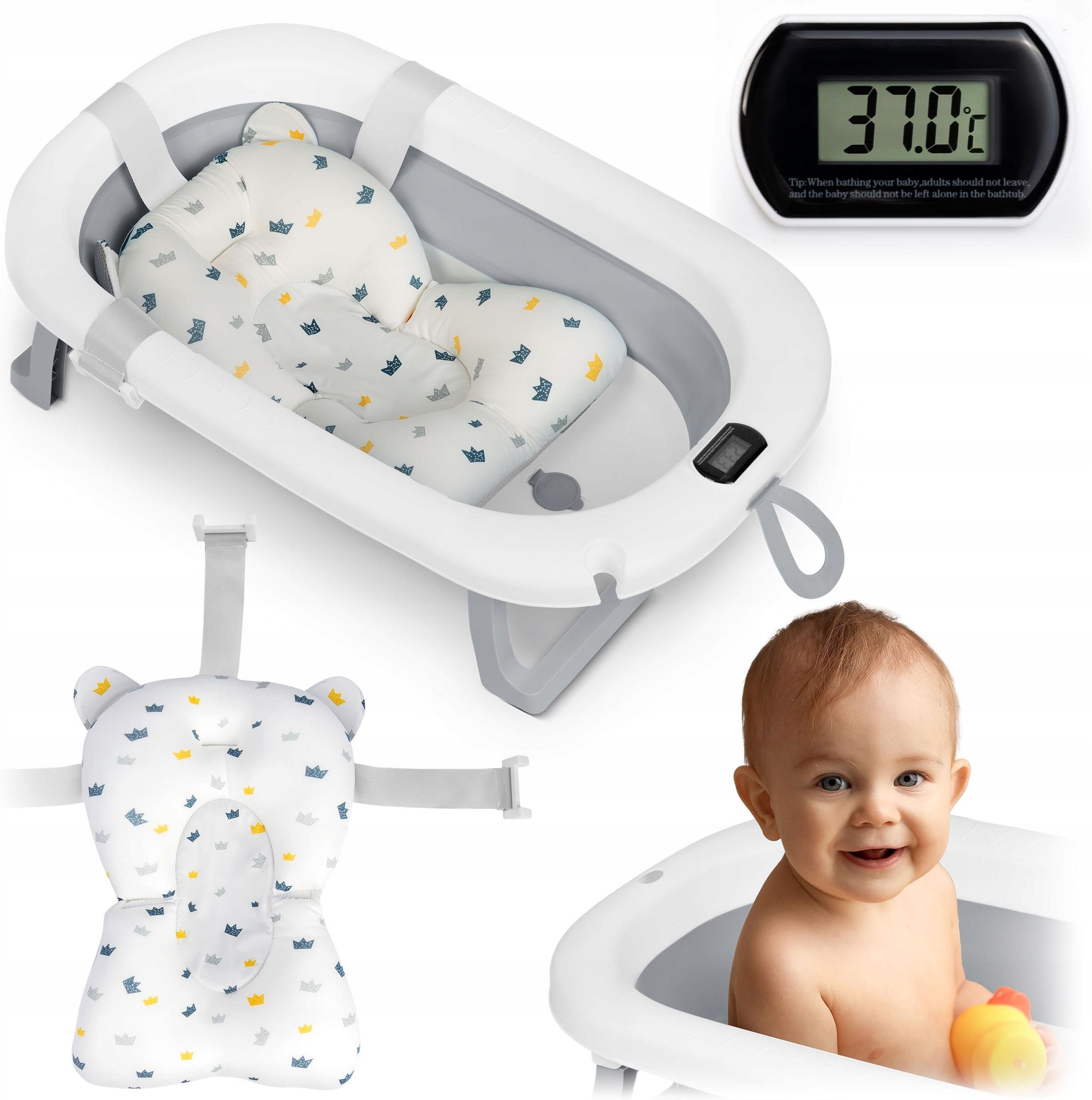Niezawodna wanienka dla dzieci z wkładką dla noworodków i wbudowanym termometrem. Komfortowa i funkcjonalna składana, lekka, maksymalne obciążenie: 45 kg. Bezpieczna antypoślizgowe nóżki, z wbudowanym termometrem, korek zmienia kolor pod wpływem temperatury wody (powyżej 38 stopni). Jakość premium spełnia rygorystyczne europejskie normy bezpieczeństwa, dopracowana w każdym detalu. Delikatne wsparcie od pierwszych dni – miękka, szybkoschnąca wkładka dla noworodka W zestawie z wanienką otrzymujesz delikatną, profilowaną wkładkę, która łagodnie podpiera główkę i plecki maluszka. Dzięki trzem solidnym uchwytom mocujesz ją pewnie na krawędziach wanienki – bez zsuwania, bez stresu. Wkładka wykonana jest z szybkoschnącego materiału, więc po kąpieli wyjmiesz ją i odsączysz w mgnieniu oka. Maksymalny komfort i higiena podczas każdej chwili spędzonej w wodzie! Jakość premium wysokiej jakości szybkoschnąca tkanina, poduszka mocowana regulowanymi pasami, dopracowana w każdym detalu. Termometr elektroniczny ! Woda jest monitorowana w wanience za pomocą elektronicznego termometru, wyposażonego w precyzyjną sondę oraz czytelny wyświetlacz LCD, z którego odczytasz pomiar temperatury. Zwiększone bezpieczeństwo Korek zmieni swój kolor z szarego na biały, jeśli temperatura wody przekroczy 38°C. Niezawodna na każdym etapie rozwoju! Wanienka, która rośnie razem z Twoim dzieckiem. 0–6 m: z miękką wkładką noworodkową dla bezpiecznego i wygodnego podparcia. 6–18 m: bez wkładki, ale ze stabilnymi nóżkami, idealna gdy maluch sam zaczyna siadać. 18 m+: w trybie większej przestrzeni do swobodnej kąpieli ciekawskich przedszkolaków. Inwestycja na lata – od pierwszych dni aż po samodzielne chlapanie! Kąpiel bez chlapania: Wbudowany uchwyt na słuchawkę prysznica Dzięki wbudowanemu uchwytowi na słuchawkę prysznica kąpiel staje się niezwykle wygodna i bezpieczna. Stabilnie zamocowana słuchawka umożliwia swobodne nalewanie wody bez rozchlapywania – wystarczy ustawić wanienkę, wlać dokładnie tyle, ile potrzeba, i skierować strumień pod odpowiednim kątem. Stabilna i w 100% bezpieczna! Wanienka dzięki rozkładanym nogom nie złoży się w trakcie kąpieli, a antypoślizgowe nóżki zapewnią bezpieczeństwo na śliskiej powierzchni. Nie zawiera BPA ani innych szkodliwych substancji, dzięki czemu kąpiel maluszka jest w 100% bezpieczna. Kompaktowy rozmiar i wygodne przechowywanie! Dzięki możliwości złożenia wanienki w prosty sposób zabierzesz ją na wyjazd lub schowasz w łazience. Przydatna zarówno podczas codziennej pielęgnacji jak i w podróży. W łatwy i szybki sposób złożysz wanienkę. Dopracowana w każdym detalu! Eleganckie wykończenia oraz ergonomiczny projekt sprawiają, że wanienka nie tylko będzie praktycznym rozwiązaniem, lecz również stylowym elementem wystroju mieszkania. Ta uniwersalna wanienka może być przeznaczona zarówno do kąpieli niemowląt, jak i nieco większych, kilkuletnich dzieci. Maluchom wystarczy nalać 15-20 litrów wody i bezpiecznie oprzeć leżące niemowlę na specjalnej poduszce lub na pochylanym dnie wanienki. Jednak dzięki swej dużej, 45-litrowej pojemności, wanienka może posłużyć znacznie dłużej i przy całkowitym wypełnieniu wodą wygodnie wykąpie się w niej także 2- lub i 3-letnie dziecko. Idealny wybór dla Twojego dziecka! Gdy twoje dziecko wyrośnie z wanienki, możesz wykorzystać ją na inne sposoby. Stwórz basenik z kulkami do zabawy. Użyj jako miski na pranie. Użyj do kąpieli zwierząt domowych.