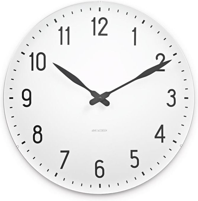 Zegar Station Wall duńskiej marki Rosendahl. Zegar będący projektem Arne Jacobsena z 1941 roku stanowi stylowe połączenie modernizmu z minimalizmem. Elegancka biała tarcza z dyskretnymi czarnymi wskazówkami przykryta jest szklaną taflą. Dokładne odmierzanie czasu gwarantuje japoński mechanizm SKP. Produkt został wykonany z wysokiej jakości wytrzymałych materiałów. Zegar można obejrzeć również na znajdującym się u dołu strony krótkim filmie. Zegar występuje w różnych rozmiarach. Materiał: aluminium, szkło mineralne Kolor: biały, czarny Średnica: 48 cm Waga: 4.3 kg Zasilanie: baterie AA 1,5 V Projekt: Arne Jacobsen, Rosendahl