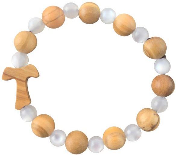 Różaniec – bransoletka z koralikami w kolorze brązowym i transparentnym, z krzyżykiem TAU, na żyłce.