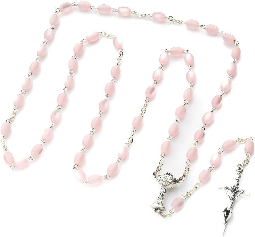 Różaniec pierwszokomunijny dla dziewczynki z paciorkami madre perla o subtelnym różowym odcieniu. Paciorki o owalnym kształcie, krzyż i łącznik włoskiej produkcji. Różaniec ma długość 49,5 cm, a każdy koralik mierzy 6 mm.
