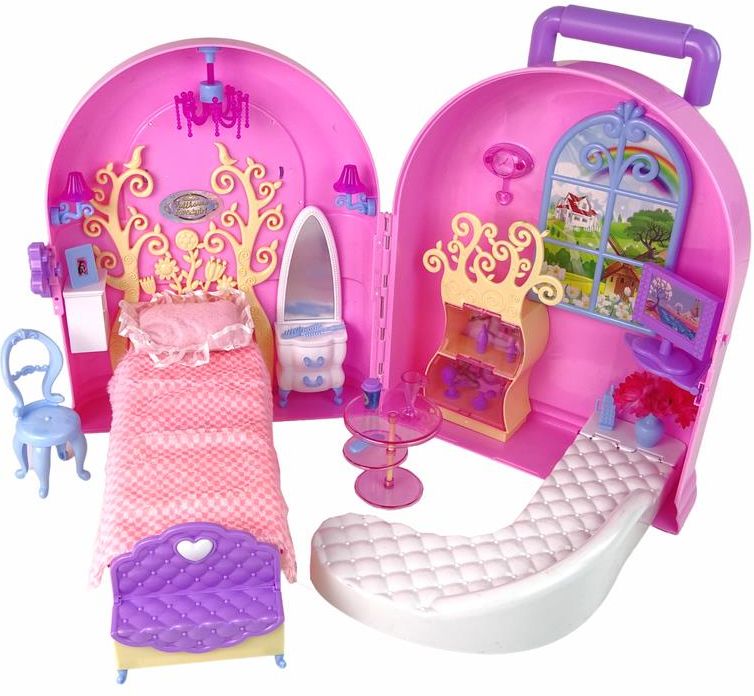 Rozkładany Duży Domek Dla Lalek Walizka Meble Domek w walizce jest zabawką, która spełni marzenie każdej fanki lalek. Domek jest rewelacyjnie wykonany, dzięki możliwości złożenia go w walizkę z regulowaną rączką można bawić się nim w dosłownie każdym miejscu. Zamyka i otwiera się za pomocą uroczego motylka. Ekskluzywny domek dostosowany jest do lalek o wysokości 29 cm, dzięki czemu będzie mogła się w nim bawić każda lalka z kolekcji dziewczynki. Złożony domek przypomina bardzo dziewczęcą, pastelową walizeczkę z długą rączką. Jasne, różowo-fioletowe kolory połączone są z białymi dodatkami, co z pewnością spodoba się każdej dziewczynce. Wnętrze walizeczki kryje kompletny zestaw elementów potrzebnych do zabawy lalką. Domek dla lalek jest bardzo przestrzenny, idealny do życia dla jednej lalki, która może zapraszać swe przyjaciółki na kawę. Dom dzieli się na dwie części — wypoczynkową oraz sypialnianą, znajdują się w nim przeróżne elementy — między innymi sofa i łóżko, a także stolik, kawa w kubku i telewizor plazmowy. Wszystkie elementy składające się na zestaw są bardzo starannie wykonane, inspirowane są prawdziwymi, pełnowymiarowymi dodatkami. W domku dla lalki znajdują się: - duże składane łóżko, - sofa z pojemnikiem na pościel, - toaletka z lustrem, - szafka nocna z otwieraną szufladką, - 2 abażury, - aplikacja na ścianie i zegar, - szafka z otwieranymi drzwiczkami, - olbrzymia sofa, - półeczka, - telewizor plazmowy z pilotem, - stolik z krzesłem, - flakon z kwiatami, - ramka z fotografią, - telefon komórkowy, - ozdobna figurka z delfinkiem, - kawa w kubku i drink z kostkami lodu, - szczotki do włosów i 3 buteleczki z atrapami kosmetyków, - mięciutka poduszka i kołderka. Wymiary elementów zabawki: - rozłożony domek: 57 cm x 8,5 cm, - wysokość do dachu: 35 cm, - wysokość do rączki: 51,5 cm, - łóżko: 30 cm x 11 cm, - sofa: 40 cm x 8,5 cm x 4 cm. Wymiary pudełka: 36 cm x 29.5 cm x 17.5 cm Lalka nie jest dołączona do zestawu! Domek w walizce wykonany jest z atestowanego, solidnego plastiku. Zabawka posiada certyfikat CE, gwarantujący bezpieczeństwo płynące z użytkowania zabawki. Komplet elementów zapakowany jest w kolorowe pudełko, idealnie pasujące na prezent dla dziewczynki.