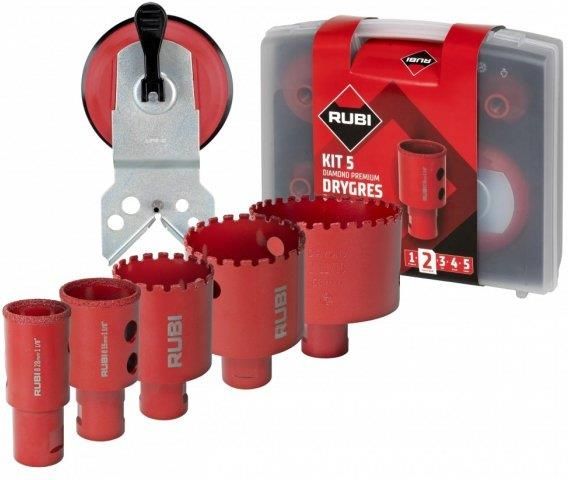 Opis zestawu wierteł diamentowych DRYGRES PREMIUM 51937 Wiertła DRYGRES PREMIUM są stworzone do wiercenia w gresie, porcelanie, granicie i marmurze. Diament w koronkach nakładany jest technologią lutowania próżniowego, co zwiększa ich odporność na wysokie temperatury oraz tarcie. Zestawy z koronkami DRYGRES PREMIUM pozwalają na profesjonalne przygotowanie otworów pod instalacje wodne, odpływy, puszki elektryczne itd. Dzięki gwintowi M14, mogą być używane bezpośrednio na szlifierce, lub dzięki łącznikowi (ref. 05976) na wiertarce bez udaru. Średnia trwałość koronek DRYGRES PREMIUM w rozmiarach 20-75 mm to 80 do 150 otworów i ZAWSZE zależy od typu materiału i jego grubości, oraz odpowiedniego chłodzenia i użytkowania. Wiertła DRYGRES PREMIUM mogą wykonywać otwory do 30 mm głębokości (średnice 6-35 mm) lub 38 mm głębokości (średnice 43-85 mm). Boczny otwór w koronkach DRYGRES PREMIUM 20-85 mm pozwala na lepsze chłodzenie i usuwanie pozostałości po wywierceniu każdego otworu. Należy pamiętać o każdorazowym oczyszczeniu i sprawdzeniu wiertła przez rozpoczęciem wiercenia. Średnice 43-85 mm mają segmentowe obrzeże dla lepszej stabilności podczas wiercenia. Maksymalna szybkość robocza wiertła wynosi od 14000 obr/min. Dla zapewnienia dobrego wykończenia otworu oraz trwałości wiertła nie należy przekraczać podanych wielkości obrotowych, jednocześnie zaleca się wykonywanie okrężnych ruchów wiertłem dla lepszego chłodzenia. Dane techniczne Średnica wierteł: 28, 35, 43, 50, 68 mm Gwint: M14 Max. głębokość wiercenia: 30/38 mm Zalecana prędkość: 1400 obr/min Opis prowadnicy MULTIDRILL RUBI Prowadnica MULTIDRILL umożliwia dokładne centrowanie wierteł podczas wiercenia na sucho jak i na mokro. Dzięki mocowaniu na przyssawkę prowadnica MULTIDRILL pozwala wykonywać otwory na powierzchniach poziomych i pionowych. Zapewnia wiercenie dokładnie w wyznaczonym miejscu, bez ryzyka przesunięcia się wiertła. Współpracuje z wiertłami DRYGRES, EASYGRES, FORAGRES, MINIGRES do średnicy 83 mm. Posiada przyłącze do wężyka hydronetki (ref. 50947) Dane techniczne Obroty na minutę - 14000 max. Maksymalna długość wiercenia - 36 mm W dostawie Zestaw wierteł diamentowych DryGres z prowadnicą RUBI 51937 6el.