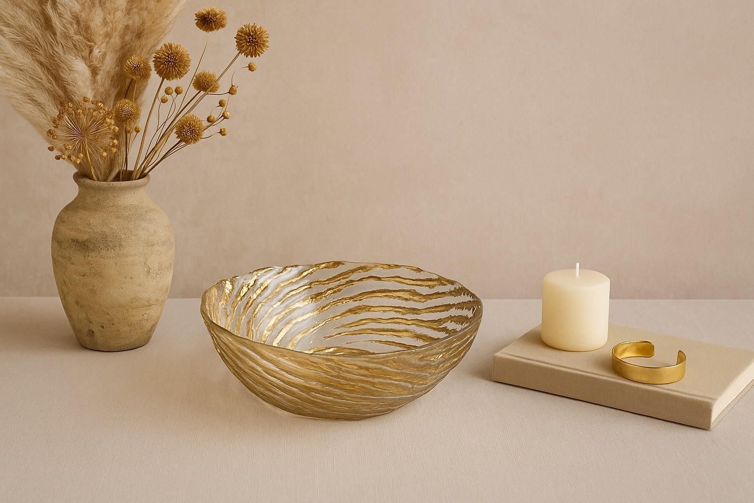 Wyjątkowa szklana salaterka dekoracyjna to połączenie elegancji i nowoczesnego stylu. Jej powierzchnia ozdobiona została nieregularnym wzorem w złotym kolorze, który przyciąga wzrok i nadaje naczyniu luksusowego charakteru. Spiralne zdobienia tworzą efektowną strukturę, pięknie odbijając światło i dodając aranżacji stołu wyrafinowanego uroku. Salaterka doskonale sprawdzi się jako naczynie na owoce, przekąski, sałatki czy drobne dekoracje. Może być również wykorzystywana jako samodzielna ozdoba wnętrza – na stole w jadalni, komodzie czy stoliku kawowym. Dzięki swojemu designowi świetnie komponuje się z aranżacjami glamour, klasycznymi i nowoczesnymi. Cechy produktu: Materiał: szkło Kolor: transparentny ze złotym zdobieniem Wzór: spiralny, strukturalny Kształt: okrągły, z delikatnie falowanymi krawędziami Zastosowanie: sałatki, owoce, przekąski, dekoracje Dlaczego warto? Unikalny design – efektowne złote zdobienia nadają salaterce prestiżowego wyglądu Funkcjonalność i dekoracyjność – praktyczne naczynie i elegancka ozdoba w jednym Ponadczasowy charakter – idealna na co dzień i na wyjątkowe okazje Ta szklana salaterka to propozycja dla osób, które cenią stylowe dodatki i chcą nadać swoim wnętrzom wyjątkowego charakteru. Zdjęcie tytułowe ma charakter poglądowy. Prezentowana aranżacja może zawierać elementy dekoracyjne niewchodzące w skład zestawu. Szczegóły dotyczące zawartości znajdują się w opisie produktu.