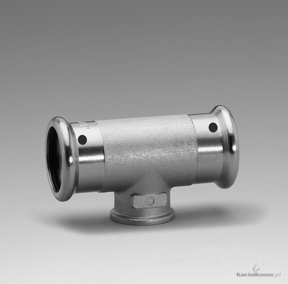 SANHA-Therm Trójnik PxGWxP 35 mm x 1/2" x 35 mm GW Ciśnienie robocze (woda i roztwory wodne): 16 bar Ciśnienie robocze (gazy techniczne (nietoksyczne, niepalne)): 16 bar Temperatura robocza: -30 °C - +120 °C Gwinty rurowe: Gwinty R/Rp zgodnie z PN-EN 10226 Gwint mocujący (ÜWM): Gwint-G zgodnie z PN-ISO 228 Opis systemu System SANHA®-Therm składa się ze złączek zaciskowych wykonanych z ocynkowanej stali węglowej z czarnymi o-ringami z EPDM, łączonych z ocynkowanymi rurami SANHA®-Therm ze stali węglowej. Starannie dopracowane komponenty systemu SANHA®-Therm stanowią doskonałe rozwiązanie dla zamkniętych systemów grzewczych, instalacji sprężonego powietrza oraz wybranych systemów gaśniczych (z rurą DZ- obustronnie ocynkowaną). Wariant "Contiflo" oferuje dodatkowo system rur ocynkowanych wykonanych ze stali węglowej, charakteryzujących się bardzo wysoką elastycznością. Wszystkie złączki serii SANHA®-Therm oznakowane są na zewnątrz dobrze widocznym czerwonym punktem. Kompleksowe korzyści combipress = Kompatybilność narzędzi: możliwość zaciskania za pomocą szczęk lub pętli zaciskowych o oryginalnym profilu SA, V, M do 54 mm. Nie ma ryzyka użycia niewłaściwego narzędzia natomiast zapewnione jest większe bezpieczeństwo "Niezaciśnięte-nieszczelne" (wymuszona nieszczelność przed zaciskaniem w przypadku EPDM i HNBR) Push & Stay: (przyczepność ślizgowa) w celu zapewnienia łatwego i bezpiecznego montażu w każdej pozycji Szybki montaż, bez zagrożenia pożarowego Połączenie z rurami ze stali ocynkowanej przez zacisk umożliwia szybki i bezpieczny montaż bez użycia otwartego ognia w pomieszczeniu. Przydatne zalety podczas modernizacji istniejących obiektów. Uwaga! Rur i złączek systemu SANHA®-Therm nie należy prowadzić w posadzkach i ścianach ze względu na korozyjne właściwości wylewek samopoziomujących. W przypadku przyłączy grzejnikowych wychodzących z posadzki należy zadbać o izolację zapewniającą ochronę przewodów przed działaniem środków dezynfekujących.