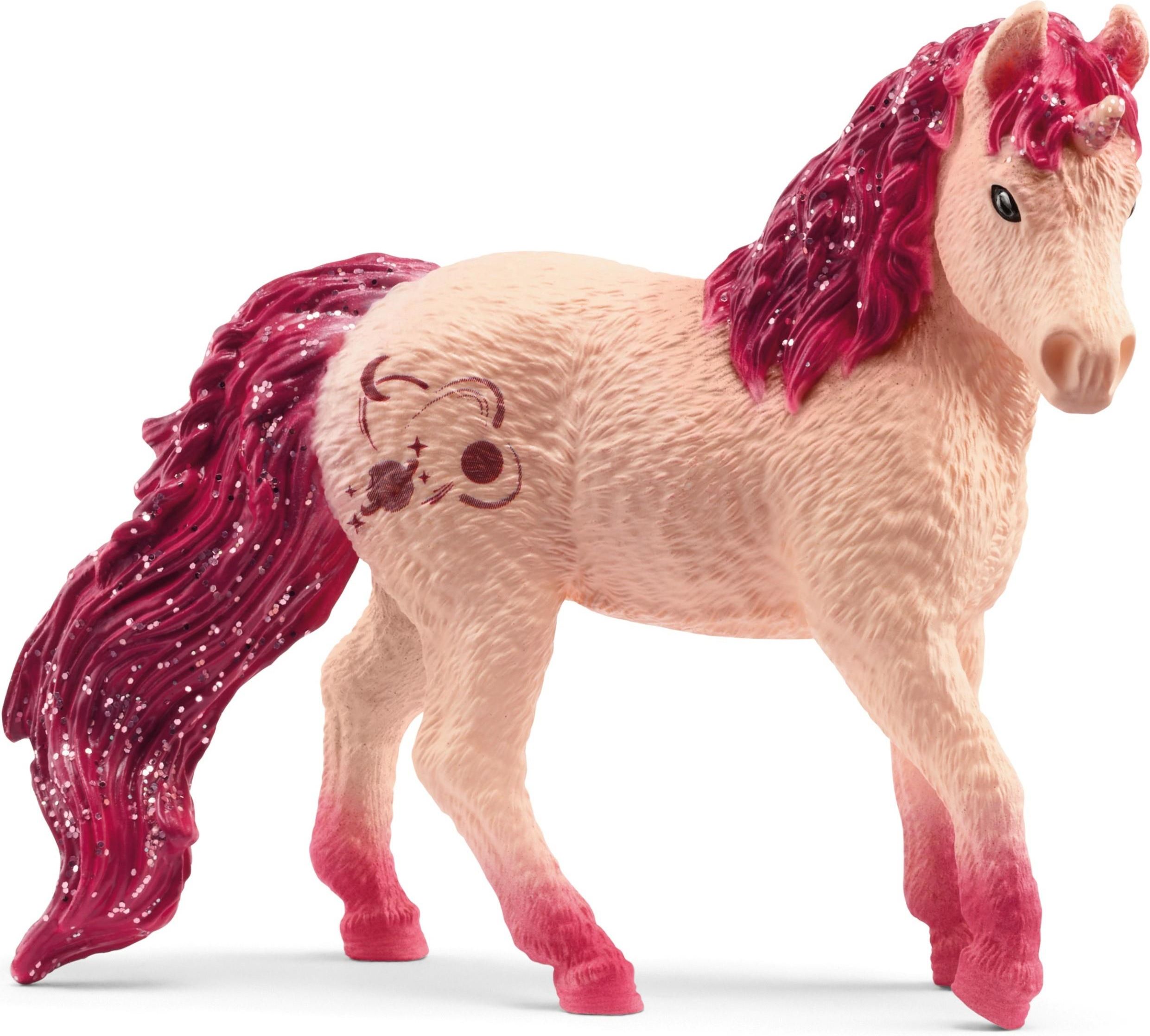 Schleich Bayala Jednorożec Planetea. Kolekcjonerski Jednorożec z rodziny Universe nie może się doczekać: chce dołączyć do zabawy! Wyciąga swoją śliczną głowę z jaskrawo kolorową, błyszczącą grzywą i ciekawie patrzy, co się dzieje. Tymczasem inne jednorożce już skaczą radośnie. Może powinien …