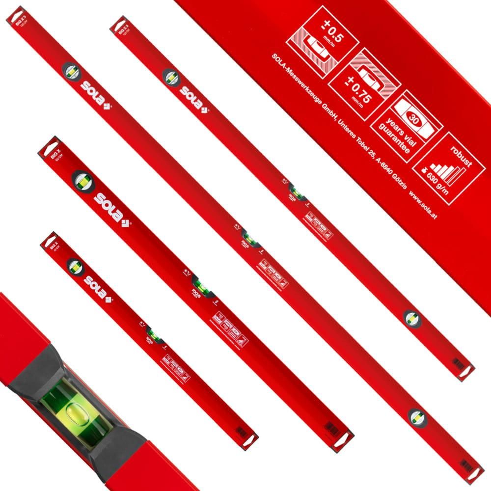 Opis poziomic Sola Big X / Big X 3 Bardzo wysoka dokładność pomiaru w pozycji standardowej i odwróconej Ergonomiczny profil aluminiowy o wysokiej sztywności skrętnej zapewnia precyzyjne wyniki pomiarów Lepszy, szybszy i dokładniejszy odczyt dzięki opatentowanym libelkom Sola Focus Odporne na uszkodzenia mechaniczne libelki blokowe ze szkła akrylowego z soczewką powiększającą o +60% Lepsza czytelność w słabych warunkach oświetlenia dzięki okładzinie podświetlającej Sola Obustronne zaślepki 2-K absorbują uderzenia chronią optymalnie przed uszkodzeniem Zdjęcia podglądowe Dane techniczne Masa profilu: 630g/m Profil: aluminiowy Wymiar profilu: 52x25mm Tolerancja pomiaru w poz. standardowej: 0,50 mm/m (0,029°) Tolerancja pomiaru w poz. odwróconej: 0,75 mm/m (0,043°) Libelki poziome: 1 Libelki pionowe: 1 / 1 / 2 / 2 Zaślepka: 2-K Długość: 40 / 80 / 120 / 200cm W dostawie Poziomica Sola Big X 40cm 01370501 Poziomica Sola Big X 80cm 01371101 Poziomica Sola Big X 3 120cm 01373401 Poziomica Sola Big X 3 200cm 01373701