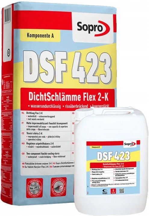 SOPRO DSF 423 - wzmocniona, elastyczna zaprawa uszczelniająca Pojemność: 24kg (składnik A) + 8kg (składnik B) Dwuskładnikowa, wzmocniona włóknami, cementowa zaprawa uszczelniająca do wytwarzania elastycznych powłok, nie przepuszczających wody i mostkujących pęknięcia. Uszczelnienie zespolone balkonów, tarasów, natrysków, pralni, toalet, basenów kąpielowych. Przy renowacji istniejących, trwałych i nośnych okładzin z płytek ceramicznych na balkonach i tarasach (metodą „płytka na płytkę”). Jako uszczelnienie od wewnątrz w zbiornikach wody użytkowej do 6 m głębokości. WŁAŚCIWOŚCI Paroprzepuszczalna Wzmocniona włóknami Już po 2-2,5 godzinach odporna na deszcz Szczególnie zalecana na balkony i tarasy Odporna na działanie promieni UV Stosowana również jako ochrona betonu przed karbonatyzacją ZASTOSOWANIA Do wytwarzania uszczelnień zespolonych w pomieszczeniach (np. natryski, węzły sanitarne, toalety) do zastosowań zgodnie z normą DIN 18534 cz. 3 w klasie oddziaływania wody W0-I „niskie”, W1-I „umiarkowane”, W2-I „wysokie” i W3-I „bardzo wysokie” (odpowiada również klasie obciążenia wodą A i A0 zgodnie z listą uregulowań niemieckiego nadzoru budowlanego oraz wytycznych ZDB). Do wytwarzania uszczelnień zbiorników wody użytkowej i niecek (np. basenów kąpielowych) zgodnie z normą DIN 18535 cz. 3 w obszarach zastosowań W1-B i W2-B „Do 6 m wysokości słupa wody” (odpowiada również klasie obciążenia B zgodnie z wytycznymi ZDB). Do uszczelniania balkonów i loggii zgodnie z normą DIN 18531 cz. 5