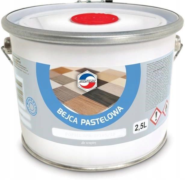Bejca pastelowa SOPUR BPA-DF344/16 beż 2,5L Szybkoschnąca, jednorodna i łatwo rozlewająca się bejca do drewna iglastego i liściastego. Posiada szeroką gamę modnych, rozbielonych kolorów nawiązujących do barw natury. Produkt na bazie rozpuszczalników organicznych i pigmentów, który charakteryzuje się dobrą odpornością na światło wewnątrz pomieszczeń. Zastosowanie bejcy obejmuje dekoracyjne malowanie drewnianych i drewnopochodnych elementów meblowych, schodów i podłóg. Bejca jest dostępna w trzech liniach o różnych parametrach, w zależności od oczekiwanych efektów i potrzeb użytkownika. Przed aplikacją, drewniane powierzchnie powinny być dokładnie oczyszczone i wyszlifowane, a wyrób bejcy dokładnie wymieszany. Bejce pastelowe można nanosić natryskiem pneumatycznym lub hydrodynamicznym na różne gatunki drewna. W celu podkreślenia pór drewna, bejce o indeksach BPA i BPA-D można przetrzeć flanelą wzdłuż słojów drewna. Kolory mogą się różnić w zależności od ustawień monitora czy telefonu. Barwienie należy wykonywać w temperaturze otoczenia od 5°C do 30°C. Po aplikacji, barwione elementy należy suszyć w temperaturze 20°C przez około 15-30 minut. Powierzchnie wybarwione należy pokryć warstwą nawierzchniową o wysokiej odporności na promienie UV, zgodnie z instrukcją jej stosowania. Czas schnięcia: ok. 15-30 minut Wydajność: ok. 10 m2/l Stosowanie: do wnętrz Pojemność: 500ml Zachęcamy do wyboru bejcy pastelowej SOPUR, która zapewni równomierne i trwałe wybarwienie drewna, nadając mu naturalnego i modnego wyglądu. Warto jednak pamiętać, że kolory wyświetlane na monitorze lub telefonie mogą się nieznacznie różnić od rzeczywistych odcieni bejcy. UWAGA! Ze względu na gęsty pigment, przed jak i w trakcie aplikacji, bejce należ starannie wymieszać mechanicznie!