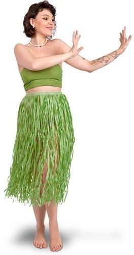Spódnica hawajska z rafii w kolorze zielonym. Rozmiar uniwersalny dla dorosłych. Spódnica ma elastyczną gumkę w pasie. Wymiary produktu: długość 77 cm, szerokość w pasie 31,5 cm