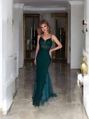 Zjawiskowa długa sukienka w kształcie tulipana ozdobionym koronką Sukienka wykonana z miękkiego elastycznego materiału , góra gorsetowa usztywniana z wszytymi miseczkami ozdobiona przepiękną koronką ozdobioną cekinkami.Regulowane cieńkie ramiączka.Tył zapinany na zamek W dole po bokach wstawki …