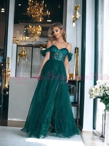 Zjawiskowa długa sukienka gorsetowa. Góra satynowo tiulowa z profilowanymi ,usztywnianymi miseczkami ozdobiona koronką, cieńkie odpinane ramiączka..delikatne tiulowe rękawki. Dół tiulowy z delikatnym brokatem i rozcięciem .Tył sznurowany i zapinany na zamek Kreacja idealnie sprawdzi się na wesele …