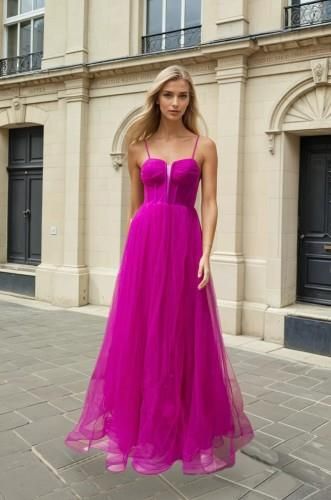 Zjawiskowa długa sukienka tiulowa z rozcięciem eksponującym nogę. Góra sukienki gorsetowa z pięknym dekoltem. Wszyte miseczki pozwalają na nie zakładanie biustonosza. Cieńkie ramiączka .Tył odkryty , sznurowany. Dół sukienki uszyty z dwóch warstw zakończony krynoliną. Cała kreacja ozdobiona jest …