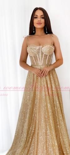 Zjawiskowa długa sukienka tiulowa ozdobiona wtłoczonym brokatem. Góra sukienki gorsetowa na fiszbinach z cienkimi ramiączkami ozdobionymi koralikami i kokardkami. Wszyte miseczki pozwalają na nie zakładanie biustonosza. W pasie ozdobny pasek z koralikami. Tył lekko odkryty , zapinany na zamek. Dół …