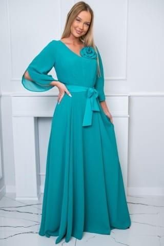 Zjawiskowa długa sukienka z pięknym tulipanowy rękawkiem.. Sukienka uszyta jest z żorżety Góra z niedużym dekoltem i ozdobnym odpinanym kwiatem. W pasie ozdobna szarfa która ładnie podkreśla talie.. Tył zabudowany zapinany na zamek. Kreacja idealnie sprawdzi się na wesele dla gościa lub druhny a …