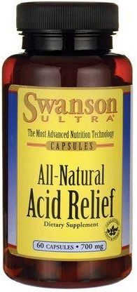 SWANSON ACID RELIEF ⭐ Przeciw Refluksowi Suplement diety - 700 mg 60 kapsułek Preparat wspierający funkcjonowanie układu pokarmowego. Wspiera utrzymanie prawidłowego pH układu trawiennego oraz ciała, co skutkuje polepszeniem przyswajania składników odżywczych. Wspomaga redukcję wytwarzania kwasów …