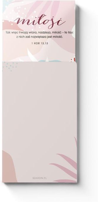Notes z Magnesem Miłość Piękny Notatnik z Inspirującym Przesłaniem Przedstawiamy notes z magnesem Miłość, który łączy w sobie praktyczność i duchowe przesłanie. Idealny do zapisywania codziennych notatek, list zakupów czy ważnych przypomnień. Wyjątkowy design z wersetem biblijnym sprawia, że ten notes jest nie tylko funkcjonalny, ale także stanowi inspirację na każdy dzień. Dzięki mocnemu magnesowi można go łatwo przymocować do lodówki lub innych metalowych powierzchni, co pozwala mieć go zawsze pod ręką. Na notesie widnieje piękny werset z 1 Listu do Koryntian 13:13: Tak więc trwają wiara, nadzieja, miłość te trzy: z nich zaś największa jest miłość. Ten cytat przypomina o sile i pięknie miłości, tak ważnej w naszej codzienności. Cechy produktu:Wysokiej jakości papier idealny do codziennego zapisywania notatek i listMocny magnes pozwala przymocować notes do lodówki, tablicy magnetycznej lub innych metalowych powierzchniElegancki design delikatne wzory i inspirujący cytat nadają mu wyjątkowego charakteruWymiary: 10 x 21,5 cm Dodaj ten notes z magnesem do swojego koszyka i ciesz się praktycznym miejscem na codzienne notatki, które przypomina o sile wiary, nadziei i miłości w Twoim życiu. NAZWA NOTES Z MAGNESEM - MIŁOŚĆ PRODUCENT SZARON EAN 5905316503922 Znajdź podobne według klucza: SZARON (683496)