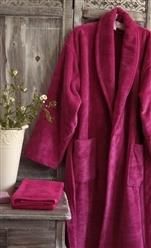 DUO - Szlafrok kolor Fuksja Szlafroki wykonane są z dzianiny o specjalnej konstrukcji: BAWEŁNA od strony wewnętrznej gwarantuje chłonność oraz przyjemny kontakt ze skórą, a super miękki WELUR na stronie zewnętrznej podkreśla subtelny wygląd szlafroka. Skład: 52% bawełna, 48% poliester Gramatura: 320 g/m2