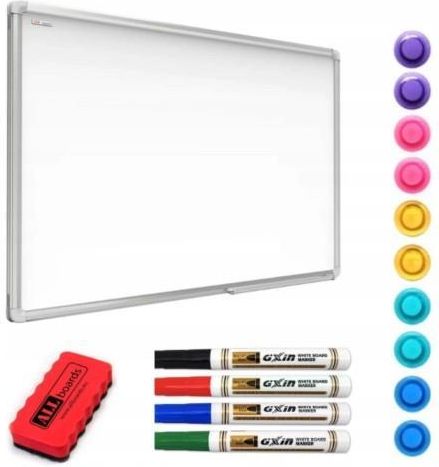 Tablica magnetyczna biała 150x120 cm suchościeralna w aluminiowej ramie PREMIUM EXPO + zestaw akcesoriów POWIERZCHNIA - magnetyczna tablica ALLboards wykonana jest z blachy lakierowanej na biało, co zapewnia idealnie gładką powierzchnię, łatwość w czyszczeniu oraz długoletnią wytrzymałość. Powierzchnia tablicy pozwala na używanie markerów ścieralnych oraz wszelkiego rodzaju magnesów. RAMA - wykonana z aluminium zabezpieczonego przed korozją, w eleganckim szarym kolorze. Wzmocniona konstrukcja zapewnia stabilność całej tablicy i odporność na uszkodzenia. MONTAŻ - montowana jest na ścianie za pomocą otworów w rogach tablicy. Miejsce montażu jest niewidoczne, ukryte za plastikowymi zaślepkami. Tablica może być montowana w pionie oraz w poziomie. ZASTOSOWANIE - tablica idealnie nadaje się zarówno do użytku biurowego jak i domowego. Stanowi znakomite wyposażenie nowoczesnego biura oraz placówki handlowej. Z powodzeniem sprawdza się także w domu oraz pokoju dziecięcym. ZESTAW - wraz z tablicą w zestawie znajdziemy kompletne wyposażenie pozwalające na natychmiastowe użytkowanie: zestaw montażowy, gąbkę magnetyczną + 6 białych magnesów oraz 2 markery suchościeralne. Niezawodna powierzchnia Biała magnetyczna tablica ALLboards wykonana jest z sztywnej i wytrzymałej blachy, dzięki której tablica zyskuje właściwości magnetyczne. Blacha pokryta jest warstwą lakieru, który nadaje tablicy biały kolor oraz gładką i lśniącą powierzchnię. Dzięki zastosowaniu odpowiedniego lakieru, tablice można ścierać na sucho za pomocą dołączonej do zestawu gąbki lub papierowego ręcznika. Do tablicy możemy przypinać każdego rodzaju magnesy: neodymowe, turystyczne, klasyczne, ozdobne. Znakomicie nadaje się również do wykorzystania z ramkami magnetycznymi oraz innymi magnetycznymi akcesoriami. Wytrzymała rama Tablica ALLboards otoczona jest elegancką, szarą, aluminiową ramą PREMIUM EXPO. Rama została zabezpieczona przed korozją w procesie anodowania. Anodowanie to proces, w czasie którego na powierzchni metalu wytwarza się warstwa tlenku glinu. Dzięki niemu powierzchnia ramy zostaje nie tylko zabezpieczona przed korozją ale także staje się gładka i lśniąca. Mimo wielkiej wytrzymałości, szerokość ramy to zaledwie 2 cm. Montaż Tablica jest montowana za pomocą czterech otworów znajdujących się w rogach konstrukcji. Zestaw wkrętów niezbędnych do powieszenia tablicy oraz instrukcja znajdują się w zestawie. Znajdują się w nim również eleganckie plastikowe zaślepki, dzięki czemu elementy montażowe są całkowicie niewidoczne oraz nie zaburzają estetyki tablicy. Tablica może być montowana zarówno pionowo jak i poziomo. Dostosuj ją do swoich potrzeb! Zastosowanie Biała tablica magnetyczna ma szeroką gamę zastosowań. Będzie stanowiła znakomite wyposażenie biura, firmy, sali konferencyjnej czy też sali szkolnej. Ułatwi prezentację materiałów oraz pozwoli na planowanie działań czy też ustalenie planu dnia. Tablica nadaje się również do użytku domowego. Sprawdzi się w domu jako organizer czy też planer, miejsce na magnesy turystyczne, tablica do nauki pisania, do wykonywania rysunków. Można przyczepiać do niej ważne informacje, zdjęcia, obrazy, listę zakupów, plan dnia. Możliwości są nieograniczone! Zestaw Tablica ALLboards jest znakomicie wyposażona, tak byś natychmiast mógł przejść do działania! W zestawie z tablicą znajdziesz zestaw montażowy, półkę na akcesoria (która bez problemu może zostać zdemontowana w dowolnym momencie), gąbkę magnetyczną + 6 białych magnesów oraz 2 markery suchościeralne. Dostosuj tablicę do siebie Wymiar sprzedawanej przez nas tablicy nie jest odpowiedni? Napisz do nas. Oferujemy usługę produkcji tablic na dowolny wymiar oraz w dowolnym kształcie. Możesz wybrać swój wymiar, a także wygląd całej tablicy. Zamiast białej powierzchni może to być Twój nadruk czy też zdjęcie. Skontaktuj się z nami w sprawie indywidualnej wyceny! Instrukcja montażu tablicy