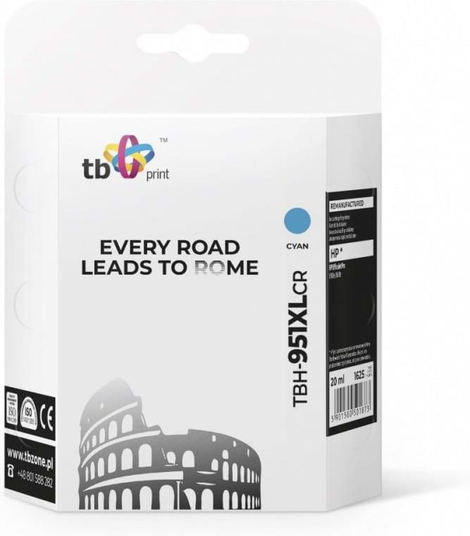 TB PRINT Tusz do HP OJ Pro 8100 TBH-951XLCR CY ref. Rodzaj wkładu: Tusz Kolor: Błękitny (cyan) Pojemność: 20 ml Wydajność (5% pokrycie): 1625 str. A4 Chip: Tak Liczba w opakowaniu jednostkowym: 1 Kompatybilność: HP Officejet Pro: 8100 ePrinter, 8600 e-All-in-One , 8600 Plus e-All-in-One Kod oryginału: CN046AE Pasuje do: HP