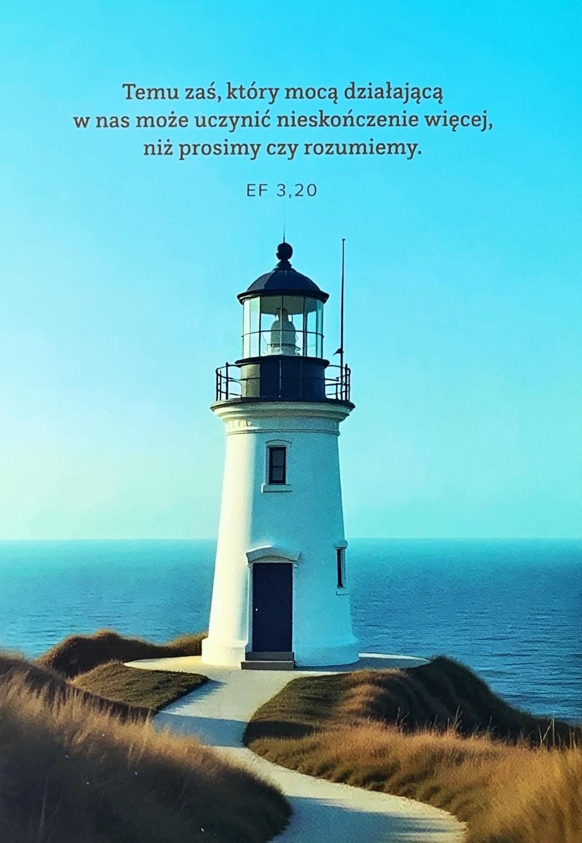 Temu zaś, który mocą działającą w nas może uczynić nieskończenie więcej, niż prosimy czy rozumiemy. Ef 3,20 Kartka z cytatem z Listu do Efezjan 3,20 przypomina o Bożej mocy, która przewyższa nasze wyobrażenia. Wewnątrz znajduje się miejsce na własny tekst lub życzenia, dzięki czemu kartka nabiera osobistego charakteru. Do kompletu dołączona jest biała koperta. Cechy produktu: Format: 112 × 158 mm Cytat: Ef 3,20 Motyw: latarnia morska Wnętrze: puste Idealna na: wsparcie, nowy etap, gratulacje Zestaw: kartka składana + koperta