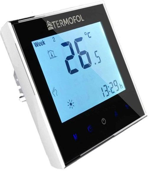 TERMOREGULATOR PROGRAMOWALNY TERMOFOL TF-H1-CZARNY Specyfikacja techniczna Pobór prądu: < 2 W, Zakres temperatury: 1–70 °C, Ograniczenie maksymalnej temperatury grzałki – podłogi : 20 °C – 70 °C, 2 czujniki: wbudowany czujnik temperatury powietrza + czujnik temperatury podłogi sensor NTC, Maksymalne obciążenie na wyjściu: 16A, Stopień ochrony: IP20, Zasilanie: 230 AC, Histereza: 0,5–2,5 °C, Histereza czujnika zewnętrznego: 1–9 °C. TERMOFOL TF-H1 MARK II CZARNY to perfekcyjne urządzenie umożliwiające zaawansowaną kontrolę Twojego systemu grzewczego. Wieloletnie doświadczenie naszych inżynierów umożliwiło stworzenie zawansowanego termostatu wyposażonego w niestandardowe funkcjonalności. Zwiększ komfort Twój i Twojej rodziny, zminimalizuj straty ciepła i korzystaj z perfekcyjnego urządzenia oferującego wiele innowacyjnych rozwiązań. Termoregulator posiada opcję mierzenia poboru energii! Jak dobrać folię grzewczą? Dobór folii grzewczej, wbrew temu co większość z nas myśli, nie zależy wyłącznie od naszych wymagań. Początkowo należy utalić moc cieplną każdego pomieszczenia, w którym chcemy dokonać instalacji. Jeżeli nie znajdziemy takich danych w projekcie, należy przyjąć szacunkowe wyliczenia na podstawie konstrukcji, przeznaczenia lokali oraz indywidualnych potrzeb. W naszej ofercie znajdziecie Państwo wiele różnorodnych modeli folii grzejnych, różniących się od siebie przedewszystkim mocą - od 60 W/m² nawet do 400 W/m². Słabsze rozwiązania, chociaż doskonale pokrywają zapotrzebowanie na moc cieplną, cechują się stosunkowo znacznym opóźnieniem czasowym (dłuższy czas oczekiwania na uzyskanie żądanych parametrów). Charakterystyka Sterowanie dotykowymi przyciskami, Programowanie temperatury 5+2 / 6+1 / 7 dni, Sposób montażu: podtynkowy – w puszce instalacyjnej, Smukły kształt – grubość tylko 27mm, Kolor CZARNY Sygnalizacja – ogrzewanie załączone, Możliwość manualnego sterowania temperaturą, Czujnik zewnętrzny – podłogowy w zestawie. sterowanie dotykowymi przyciskami programowanie temperatury 7 dni w tygodniu prosty sposób montażu smukły kształt o grubości 27mm nowoczesny wygląd duży wyświetlacz LED funkcja otwartego okna oraz Wakacje czujnik zewnętrzny w zestawie sygnalizacja włączonego ogrzewania stopień ochrony IP20 Pasuje do standardowych polskich puszek podtynkowych Schemat montażu folii grzewczej System ogrzewania podłogowego pod panele / deskę podłogową: Podłoże Czujnik podłogowy zamontowany w peszlu ochronnym Podklad izolacyjny Folia grzewcza Folia paroizolacyjna Panele podłogowe / deska podłogowa Termoregulator Nie wiesz jak ułożyć folię grzewczą? Potrzebujesz pomocy? Wejdź i zobacz film instruktażowy producenta Folii TERMOFOL na Youtube: https://www.youtube.com/watch?v=KU8DJH1sHl4 SCHEMAT PODŁĄCZENIA Folia grzewcza Zasilanie L - Faza Zasilanie N - Neutral Czujnik temperatury Termoregulator