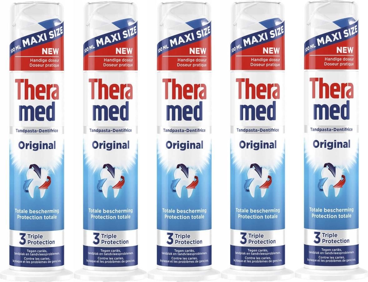 OFERTA SPECJALNA Przy złożeniu zamówienia od 80 zł otrzymacie w prezencie pastę Colgate Max White travel edition 20 ml (oszczędzacie 8 zł), a przy złożeniu zamówienia od 100 zł otrzymacie kolejną pastę Colgate Max White 20 ml (oszczędzacie 16 zł). 5x Pasta do zębów w tubce Theramed Original 100ml Pasta do zębów Theramed jest doskonałym wyborem dla osób poszukujących produktu do codziennego stosowania. Jej wyjątkowa formuła, bogata w fluor i aktywne składniki, gwarantuje dokładne oczyszczenie zębów oraz skuteczną neutralizację osadzających się kwasów. Dodatkowo, produkt zapewnia ochronę dziąseł i wzmacnia ich strukturę. 3-fazowa ochrona Przeciwdziałanie próchnicy: Specjalna formuła z fluorem skutecznie zapobiega próchnicy i wspomaga remineralizację szkliwa. Ochrona przed problemami dziąseł: Regularne stosowanie eliminuje płytkę bakteryjną, która często jest przyczyną problemów z dziąsłami. Zapobieganie powstawaniu płytki i kamienia nazębnego: Dzienna aplikacja redukuje tworzenie się płytki nazębnej, co skutecznie zapobiega tworzeniu się kamienia nazębnego. Cechy pasty Theramed Potrójne działanie: Ochrona przed próchnicą, płytką nazębną i kamieniem. Intensywne czyszczenie: Zapewnienie uczucia idealnej czystości i świeżości. Ochrona zębów i dziąseł: Formuła wzbogacona dbająca o zdrowie Twojej jamy ustnej. Bez środków wybielających: Pielęgnacja bezpieczna dla szkliwa, bez ryzyka uszkodzenia. Wygodne opakowanie: Ułatwienie dozowania i utrzymanie higieny. Wygoda użytkowania: Praktyczne i ergonomiczne opakowanie umożliwia łatwe i szybkie dawkowanie pasty, zapewniając jednocześnie czystość i higienę dla użytkowników marki Theramed. Dzięki temu codzienne pielęgnowanie jamy ustnej staje się prostsze i bardziej wygodne. Sposób użycia: Aplikuj pastę na szczoteczkę do zębów i szczotkuj zęby przez co najmniej 2 minuty, dwa razy dziennie, aby uzyskać najlepsze rezultaty. Regularne stosowanie pasty Theramed pomoże zachować zdrowe i czyste zęby oraz świeży oddech przez cały dzień.