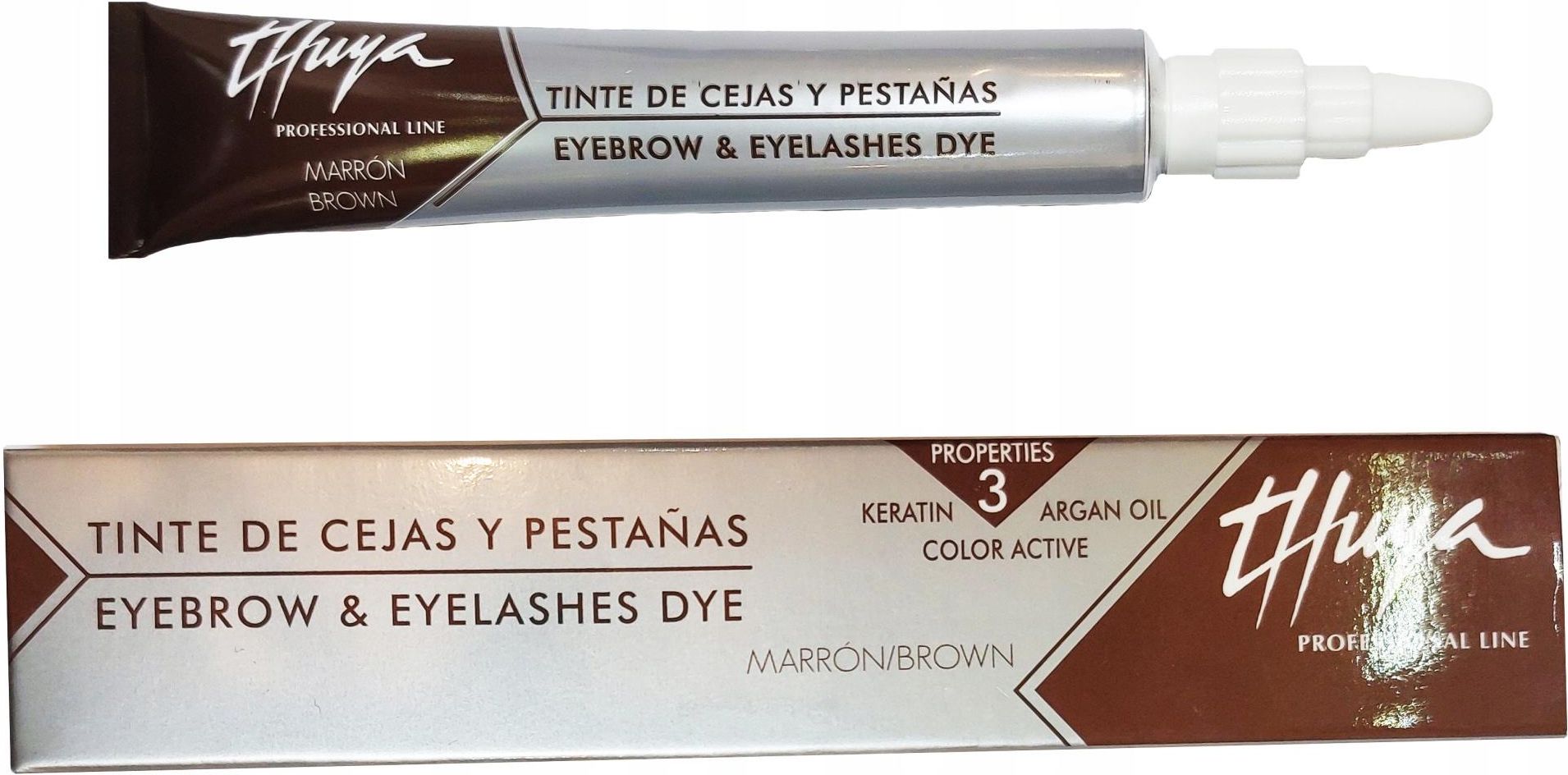THUYA Keratin Argan Olil Color Active Marron Brown14ml PROFESJONALNA FARBA DO BRWI I RZĘS - BRĄZOWA Profesjonalna i trwała farba do brwi i rzęs. Zawiera Olej Arganowy, Keratyna, Aloes oraz wiele witamin z grupy B, które stymulują włos do wzrostu. Kolor utrzymuje się we włosie nawet do 6 tygodni. Dlatego też nie zaleca się częstszego stosowania. Olej Arganowy wnika w pory włosów i poprawia ich elastyczność i giętkość. Odżywia mieszki włosowe w fazie wzrostu, chroni przed nadmierną wilgocią, co z kolei przywraca połysk włosów. Ma również właściwości kosmetyczne: zawiera naturalne przeciwutleniacze, zachowuje naturalną równowagę wilgoci, spowalnia proces starzenia się włosów, wzmacnia i odżywia rzęsy i brwi. Keratyna– wzmacnia i odbudowuje dzięki niej brwi po zabiegu stają się grubsze i zdrowsze. Aloes – działa łagodząco i przeciwzapalnie. Farbę należy rozrabiać z aktywatorem w proporcji 1:1 (aktywator nie jest dołączony do farbki). Uzyskaną papkę nałóż na brwi i zmyj dokładnie po około 10-15 minutach. Produkt profesjonalny: Tak Kraj produkcji: Hiszpania Pojemność: 14 ml