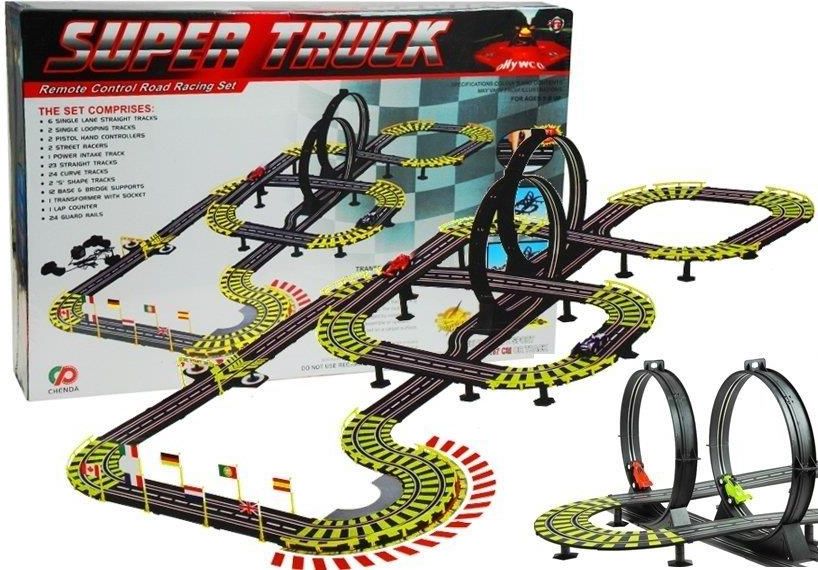 Tor Wyścigowy 11 Metrów + 2 Autka Zasilacz Tor samochodowy o długości 1157 cm z pętlami, zasilaczem sieciowym 230 V, licznikiem okrążeń, bandami, które zabezpieczają przed wypadnięciem samochodzików, mostem, trybunami oraz tunelem, "górami", "wodospadem" wśród których odbywa się pasjonujący wyścig. …