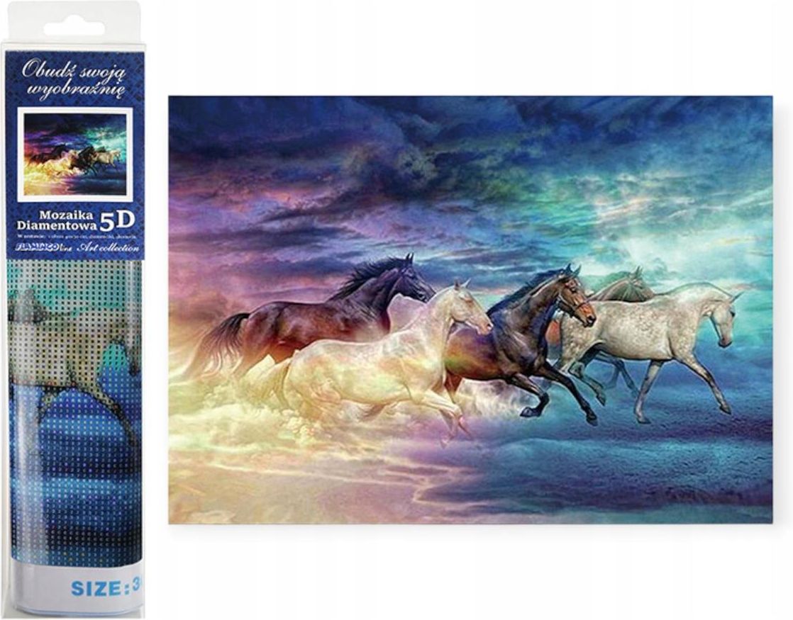 MOZAIKA DIAMENOTWA 5D KONIE HAFTOWANIE DIAMENTAMI 40X30CM TITANUM Mozaika Diamentowa 5D - KONIE (40x30cm) Mozaika diamentowa, 💎 zwana również haftem diamentowym, to doskonały sposób na kreatywne spędzenie czasu! Zestaw pozwala na stworzenie obrazu przy użyciu kolorowych diamencików, które wykleja się na płótnie według szablonu. Obraz przedstawia pięć galopujących koni w mistycznym otoczeniu, przypominającym chmury i tęczę. Każdy koń ma inny kolor sierści, a scena emanuje baśniowym, marzycielskim klimatem. Ręczne tworzenie obrazów z małych, kolorowych diamencików przynosi satysfakcję i radość, a efekty końcowe zachwycają swoim blaskiem i kolorystyką. Idealny prezent dla osób w każdym wieku, rozwijający precyzję i cierpliwość. Zawartość zestawu 1 obraz (wymiary 30x40 cm) z szablonem Kolorowe diamenciki Niezbędne akcesoria do aplikacji