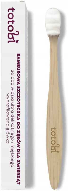 Totobi Bambusowa szczoteczka z wyprofilowaną główką, ultra miękka, do zębów dla psa i kota Czas na skuteczne oczyszczanie połączone z najwyższym poziomem delikatności Jedyna taka szczoteczka na rynku – wyprofilowana, z ekstremalnie miękkimi nano włóknami i bambusowym trzonkiem z certyfikatem pochodzenia ze zrównoważonej uprawy. Cechy i zalety: 20 000 tysięcy ultra miękkich włókien o grubości 0,8 mikrona – skuteczne czyszczenie zębów psa Idealny rozmiar główki – sprawdza się zarówno przy małych, jak i dużych psiakach Odpowiednia nawet dla bardzo wrażliwych pyszczków – bo przecież każdy pupil zasługuje na delikatność Nie podrażnia dziąseł – zachęca do pielęgnacji, zamiast zniechęcać Wyprofilowana główka umożliwia dotarcie w najtrudniejsze miejsca w pyszczku psa – nic nie umknie uwadze Wykonana z części bambusa, której nie jedzą pandy Testowana na ludziach – bo liczy się najwyższa jakość, szczególnie dla pupili Specyfikacja techniczna: Skład: Włókno Super Nano Soft Skład włókna: Nylon 610 + Nano Wheat Straw Fiber Średnica pojedynczego włókna: ~ 0,8 µm Ilość włókien: ok. 20 000 Uchwyt: Drewno bambusowe, 100% biodegradowalne Certyfikat drewna: FSC (zrównoważone uprawy) Waga: 10 g Długość szczoteczki: 17,5 cm Wymiary główki myjącej: długość – 2,5 cm, szerokość – 1,2 cm, wysokość – 1 cm Dlaczego warto? Kupując tę szczoteczkę wspierana jest inicjatywa zrównoważonego stylu życia. To ekologiczna alternatywa dla plastikowych szczoteczek, które zanieczyszczają środowisko i zalegają na wysypiskach śmieci. Wykonana z biodegradowalnych materiałów, w 100% wolna od BPA i w pełni bezpieczna w użyciu. To wybór idealny dla świadomych opiekunów i miłośników planety. Każdy mały gest ma znaczenie – razem można więcej. Sposób użycia: Nanieść pastę do zębów (najlepiej naturalną, przeznaczoną dla psa) Zwilżyć szczoteczkę i rozpocząć szczotkowanie – pomaga usuwać kamień, osad i nieświeży oddech Dzięki wyprofilowanej główce możliwe jest dotarcie do trudno dostępnych przestrzeni Po użyciu dokładnie wypłukać Regularne stosowanie poprawia higienę i komfort pupila – na koniec warto go przytulić i podrapać za uszkiem Pamiętaj, aby wymieniać co 2-3 miesiące.
