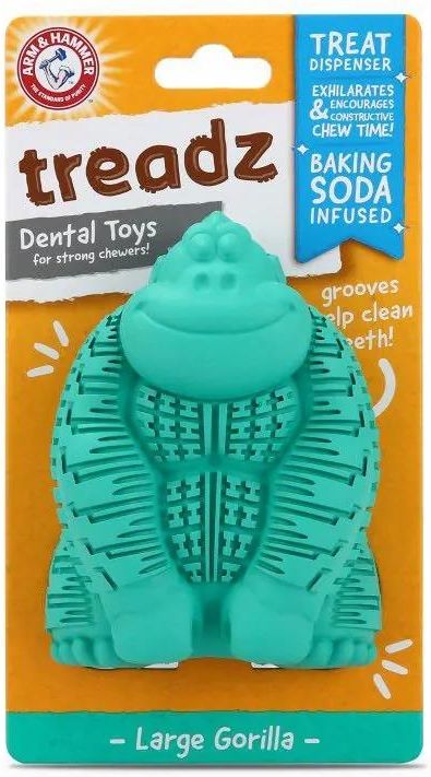 PET SUPPLIES Super Treadz Gorilla Large Zabawka na przysmaki piłka dla psa Szukasz zabawki, która zajmie Twojego psa na długo i jednocześnie zadba o jego zęby? Super Treadz Gorilla Large to idealne rozwiązanie! Ta wyjątkowa zabawka dentystyczna została wykonana z naturalnej, wytrzymałej gumy i wzbogacona sodą oczyszczoną, która pomaga w usuwaniu płytki nazębnej i neutralizuje nieprzyjemny oddech. Specjalne rowki na powierzchni zabawki umożliwiają smarowanie pastą, a dodatkowa przestrzeń w środku pozwala na umieszczenie smakołyków, co sprawia, że Twój pies będzie się nią bawił z jeszcze większym entuzjazmem. Dołącz do szalonej podróży pełnej przygód i zobacz świat z perspektywy łapy! SKŁAD Naturalna guma: Bezpieczna, elastyczna i odporna na gryzienie. Soda oczyszczona: Pomaga usuwać osad nazębny i odświeża oddech. CHARAKTERYSTYKA Materiał: Naturalna, wytrzymała guma Dodatek: Soda oczyszczona wspomagająca higienę jamy ustnej Przeznaczenie: Dla psów o masie ciała do 16 kg Funkcje: Do żucia, gryzienia i zabawy z przysmakami Wymiary: Wysokość 11,5 cm, szerokość 9 cm, długość 7,5 cm ZALETY Zdrowe zęby i świeży oddech: Soda oczyszczona wspomaga usuwanie płytki nazębnej i odświeża oddech. Stymulacja i zabawa: Możliwość umieszczenia smakołyków i pasty zachęca psa do długotrwałego żucia. Wytrzymały materiał: Naturalna guma odporna na intensywne gryzienie. Prosta w czyszczeniu: Łatwa do umycia pod bieżącą wodą. Wsparcie zdrowia jamy ustnej: Regularne żucie wspomaga higienę jamy ustnej bez konieczności szczotkowania. PRZEZNACZENIE Zabawka Super Treadz Gorilla Large została zaprojektowana z myślą o psach o masie ciała do 16 kg. Doskonale sprawdza się do żucia, gryzienia oraz zabawy z przysmakami. Specjalne rowki pozwalają na smarowanie pastą, a wnętrze zabawki można wypełnić ulubionymi smakołykami psa, co zwiększa atrakcyjność zabawy. Super Treadz Gorilla Large to doskonałe połączenie zabawy i higieny jamy ustnej Twojego psa. Żucie zabawki wspomaga usuwanie płytki nazębnej, odświeża oddech i zaspokaja naturalną potrzebę gryzienia. Możliwość umieszczenia przysmaków i pasty w rowkach sprawia, że Twój pies będzie nią zainteresowany przez długi czas. Pamiętaj, że żadna zabawka nie jest niezniszczalna – nadzoruj zabawę swojego pupila. Czy wiesz, że ... regularne żucie zabawek dentystycznych nie tylko wspomaga zdrowie jamy ustnej, ale także działa antystresowo i pomaga w rozładowaniu nadmiaru energii? To idealny sposób na zdrowie i szczęście Twojego psa!