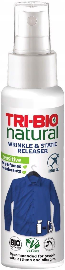TRI-BIO Żelazko w sprayu 100 ml - do usuwania zagnieceń z ubrań bez użycia żelazka Amerykański Praktyczny i wygodny w użyciu środek do likwidacji zagnieceń bez konieczności użycia żelazka. Pozwala szybko przywrócić świeży wygląd tkaninom. Wystarczy spryskać tkaninę, wygładzić ręką i poczekać do wyschnięcia. Dodatkowo, działa antystatycznie, przeciwdziałając elektryzowaniu się tkanin. Produkt szczególnie przydatny na wakacjach lub w podróżach służbowych. Ekologiczna formuła i brak sztucznych dodatków zapachowych i barwników, czyni go bezpiecznym w użyciu dla alergików i astmatyków. Zgodność trendami rynkowymi Formuła na bazie naturalnych substancji roślinnych oraz składników mineralnych Wygładza zagniecenia i fałdy na ubraniach oraz wszystkich tkaninach bez użycia żelazka Przeciwdziała zagnieceniom Działa antystatycznie Idealny w podróży lub na wyjazdy służbowe Bez substancji zapachowych i barwników –odpowiedni dla osób z alergiami i/lub astmą Certyfikowany ekologicznie, wegański WYPRODUKOWANO W USA !