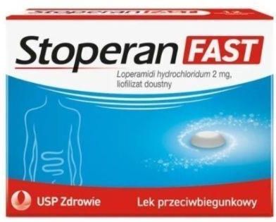 Opis Stoperan Fast to lek przeciwbiegunkowy zawierający chlorowodorek loperamidu. Działa bezpośrednio w jelitach, zmniejszając ich perystaltykę i wydłużając czas przechodzenia treści pokarmowej. W efekcie zwiększa się wchłanianie wody i elektrolitów, co przyczynia się do szybkiego ustąpienia biegunki, często już w ciągu kilku godzin. Preparat ma postać liofilizatu doustnego, który rozpuszcza się na języku bez potrzeby popijania, co ułatwia jego stosowanie w każdej sytuacji. Działanie Loperamid wiąże się z receptorami opioidowymi w ścianie jelita, hamując uwalnianie acetylocholiny i prostaglandyn. Zmniejsza to motorykę przewodu pokarmowego i wydłuża czas pasażu jelitowego. Efektem jest zwiększone wchłanianie wody oraz elektrolitów i zmniejszona częstość wypróżnień. Wskazania Stoperan Fast jest wskazany w objawowym leczeniu ostrej i przewlekłej biegunki u dorosłych oraz dzieci powyżej 6. roku życia, gdy leczenie przyczynowe nie jest możliwe ani skuteczne. Skład Substancją czynną leku jest loperamidu chlorowodorek (Loperamidi hydrochloridum). Jedna liofilizowana tabletka zawiera: 2 mg loperamidu chlorowodorku (Loperamidi hydrochloridum). Substancje pomocnicze: mannitol, pullulan, aspartam (E 951), aromat miętowy (zawierający: maltodekstrynę kukurydzianą (zawiera glukozę), substancje aromatyczne, modyfikowaną skrobię kukurydzianą (E1450)), sodu wodorowęglan, polisorbat 80. Dawkowanie To jest lek. Dla bezpieczeństwa stosuj go zgodnie z ulotką dołączoną do opakowania. Nie przekraczaj maksymalnej dawki leku. W przypadku wątpliwości skonsultuj się z lekarzem lub farmaceutą. Zalecane dawkowanie: Dorośli oraz dzieci w wieku od 8 do 17 lat w przypadku biegunki ostrej stosuje się początkowo 2 tabletki (4 mg) u dorosłych lub 1 tabletkę (2 mg) u dzieci, a następnie 1 tabletkę (2 mg) po każdym luźnym wypróżnieniu. W leczeniu biegunki przewlekłej dawka początkowa wynosi 2 tabletki (4 mg) na dobę dla dorosłych i 1 tabletkę (2 mg) na dobę dla dzieci. Dawkę dobową można modyfikować, aż do uzyskania 1–2 normalnych stolców na dobę, zwykle osiąga się to przy dawce podtrzymującej wynoszącej od 1 do 6 tabletek (2–12 mg) na dobę. Maksymalna dawka dobowa nie powinna przekraczać 8 tabletek (16 mg) u dorosłych. Dzieci w wieku od 6 do 7 lat mogą stosować 1 tabletkę (2 mg) po każdym luźnym wypróżnieniu. W biegunce ostrej nie należy przekraczać 3 tabletek (6 mg) na dobę, a w biegunce przewlekłej – 2 tabletek (4 mg) na dobę. U osób w podeszłym wieku oraz pacjentów z zaburzeniami czynności nerek nie ma potrzeby modyfikowania dawki. U pacjentów z zaburzeniami czynności wątroby lek należy stosować ostrożnie ze względu na możliwość nasilenia działania na ośrodkowy układ nerwowy. Tabletkę należy umieścić na języku, poczekać aż się rozpuści i połknąć ze śliną. Tabletek nie trzeba popijać. Biegunka może ustąpić już po jednej dawce, w takim przypadku nie należy kontynuować leczenia. W razie wrażenia, że lek działa zbyt słabo lub zbyt mocno, należy skonsultować się z lekarzem. Przeciwwskazania Nie należy stosować leku, jeśli pacjent ma uczulenie na loperamid lub którykolwiek składnik preparatu. Lek jest przeciwwskazany u dzieci poniżej 6. roku życia. Nie powinien być stosowany w przypadku ostrej czerwonki z krwią w kale i wysoką gorączką, ostrego rzutu wrzodziejącego zapalenia jelita grubego, bakteryjnego zapalenia jelita cienkiego i okrężnicy wywołanego przez bakterie Salmonella, Shigella i Campylobacter, a także rzekomobłoniastego zapalenia jelit związanego z antybiotykoterapią. Działania niepożądane Jak każdy lek, lek ten może powodować działania niepożądane, chociaż nie u każdego one wystąpią. Działania niepożądane występujące rzadko (mogą dotyczyć mniej niż 1 na 1000 osób): reakcja nadwrażliwości, reakcja anafilaktyczna (włącznie ze wstrząsem anafilaktycznym) oraz reakcja anafilaktoidalna (ciężka reakcja alergiczna na całym ciele); - utrata świadomości, obniżony poziom świadomości, wzmożone napięcie mięśniowe, nieprawidłowa koordynacja; - niedrożność jelita, rozszerzenie okrężnicy, wzdęcia; - toksyczna reakcja alergiczna skóry i błon śluzowych występująca z zaczerwienieniem, powstaniem pęcherzy i złuszczaniem naskórka (wykwity pęcherzowe, w tym zespół Stevensa-Johnsona, toksyczne martwicze oddzielanie się naskórka i rumień wielopostaciowy), obrzęk twarzy, pokrzywka, świąd. Ponadto mogą pojawić się następujące dolegliwości: Działania niepożądane występujące często (mogą dotyczyć mniej niż 1 na 10 pacjentów): zawroty głowy, zaparcie, nudności, wzdęcia. Działania niepożądane występujące niezbyt często (mogą dotyczyć mniej niż 1 na 100 pacjentów): senność, bóle brzucha, dyskomfort w obrębie jamy brzusznej, suchość w ustach, ból w nadbrzuszu, wymioty, dyspepsja, wysypka. Działania niepożądane występujące rzadko (mogą dotyczyć mniej niż 1 na 1 000 pacjentów): zwężenie źrenicy, zatrzymanie moczu, pieczenie języka, zmęczenie. Działania niepożądane częstość nieznana (nie może być określona na podstawie dostępnych danych): ból w nadbrzuszu, ból brzucha promieniujący do pleców, wrażliwość uciskowa brzucha, gorączka, przyspieszone tętno, nudności, wymioty, mogące być objawami stanu zapalnego trzustki (ostre zapalenie trzustki). Ostrzeżenia i środki ostrożności Stoperan Fast działa objawowo i nie leczy przyczyny biegunki. Gdy znana jest jej przyczyna, należy wdrożyć leczenie przyczynowe. U pacjentów z biegunką, szczególnie u dzieci i osób starszych, może dojść do odwodnienia i utraty elektrolitów. Objawami odwodnienia są między innymi suchość w ustach, zawroty głowy i wymioty. W czasie biegunki należy przede wszystkim uzupełniać płyny i elektrolity oraz zadbać o odpowiednie nawodnienie organizmu, n