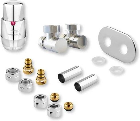 Każdy z produktów możesz kupić na życzenie w wersji do instalacji PEX lub Cu. Zgłoś ten fakt w uwagach do Sprzedającego. Zestaw odcinający Premium Exclusive w wersji kątowej. Elementy składowe w zestawie to: 1 głowica termostatyczna "Prestige", 1 przyłącze kątowe o rozstawie podłączenia do instalacji 50 mm, 1 rozeta maskująca podwójna, 2 tuleje maskujące oraz 2 złączki do wybranej instalacji.